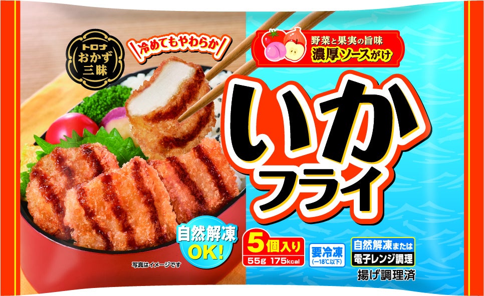 冷めてもおいしいいかフライに、野菜と果実の旨みが詰まった濃厚ソースをかけました。お弁当のもう一品にぴったりなサイズで、自然解凍が可能です。