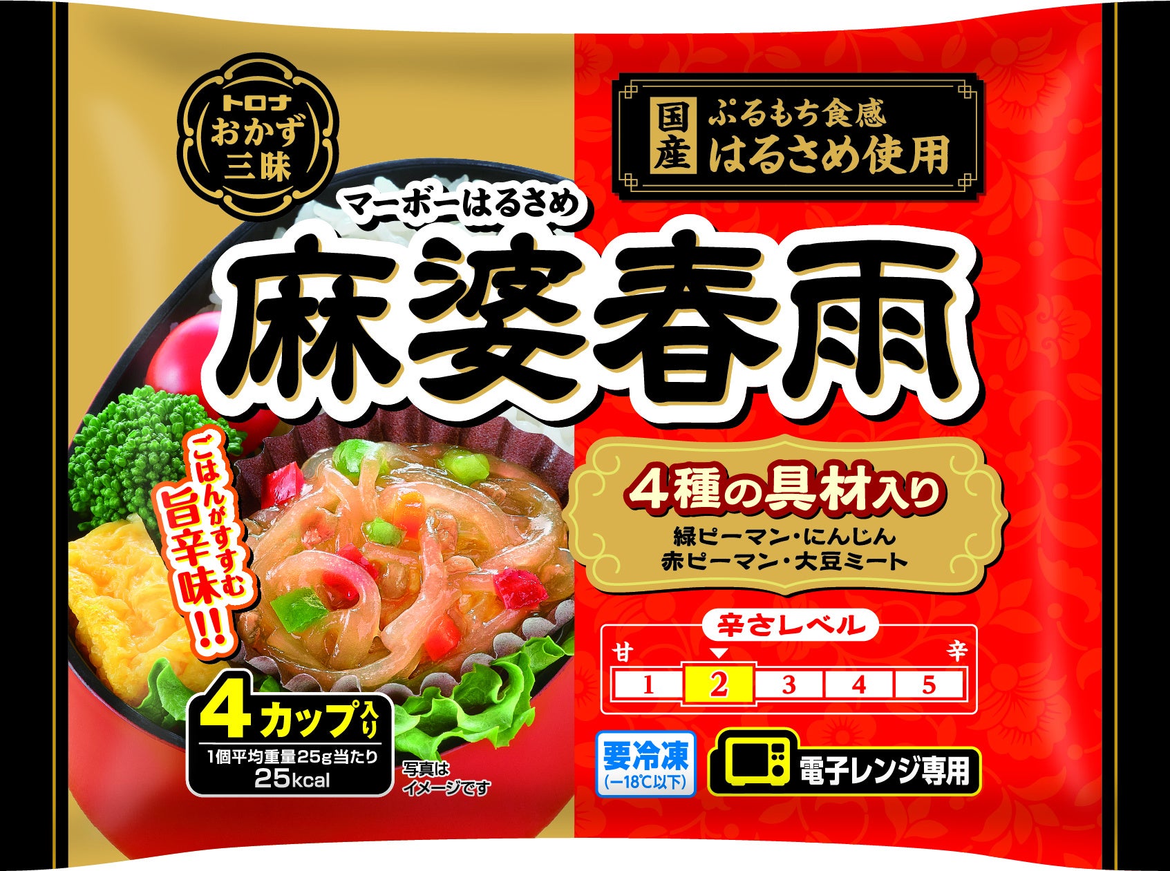 独特なぷるもち食感が楽しめる国産はるさめを使用。4種の具材を加えることで彩りも豊かに仕上げました。旨辛に味付けた麻婆春雨はごはんとの相性がよく、 紙カップ入りなのでお弁当に便利です。