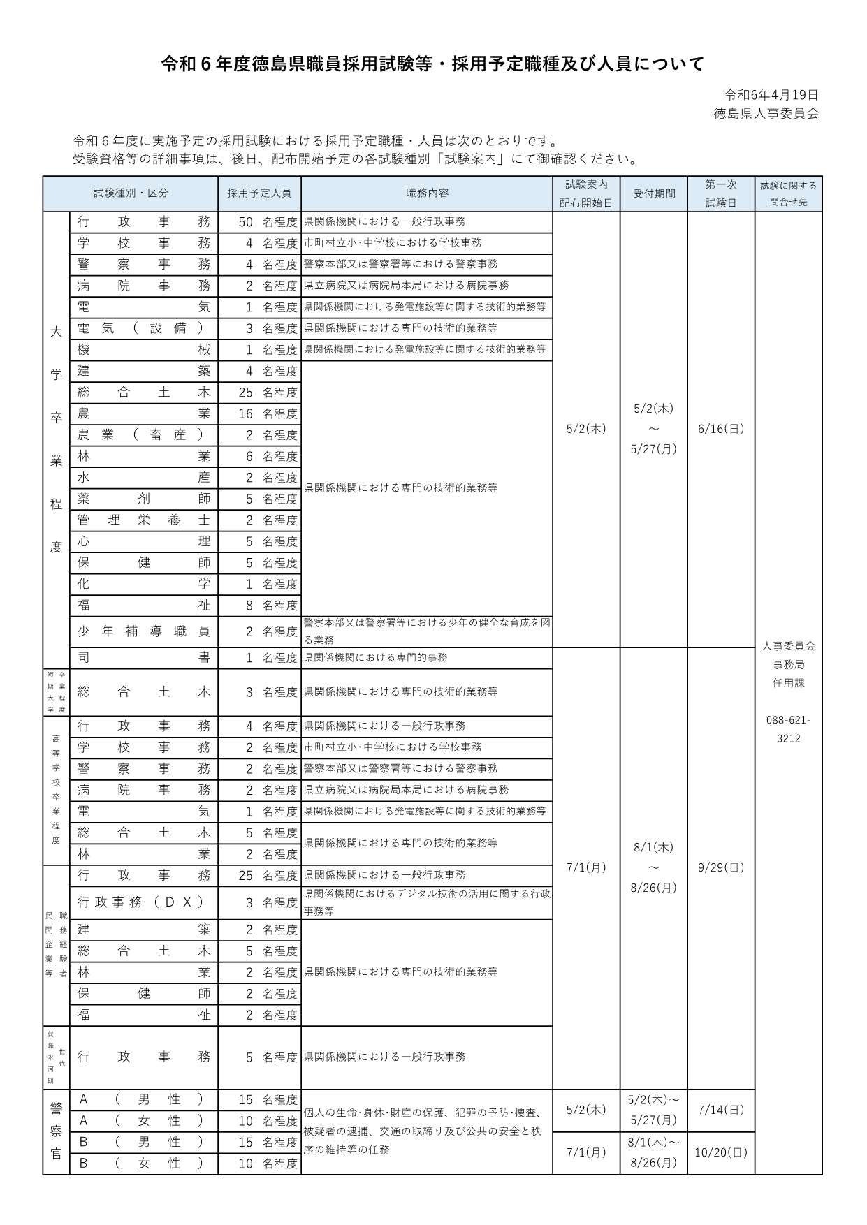 令和6年度の徳島県職員採用試験等における採用予定職種及び人員を公表しました。