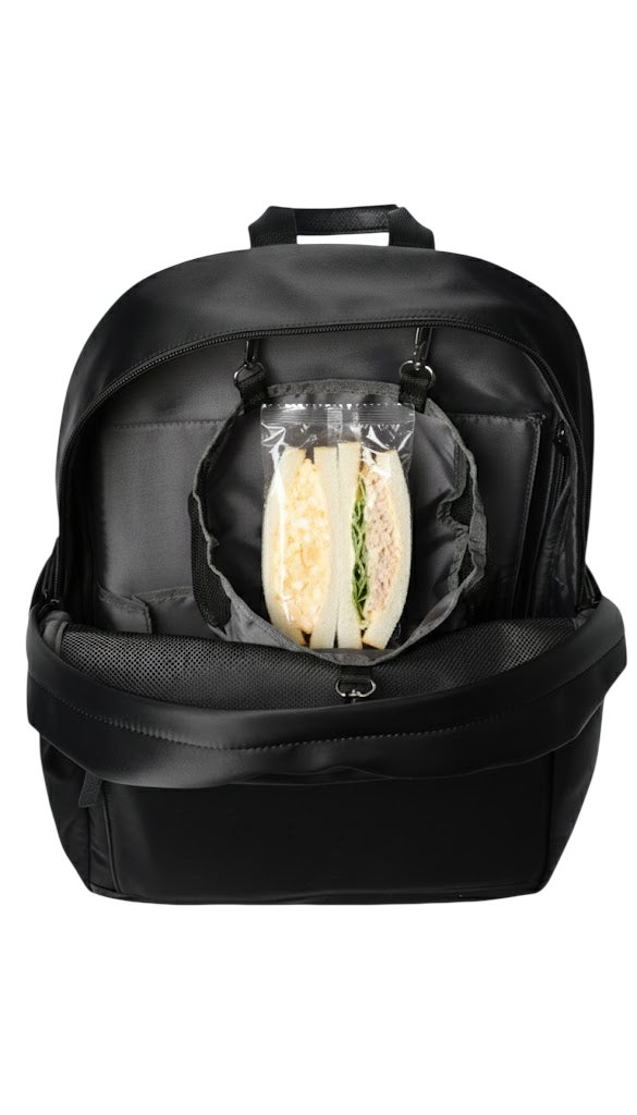 浮かせるハンモックポケットで鞄の中のサンドイッチをつぶさない!さまざまなビジネスシーンでマルチに活躍するリュックを企画