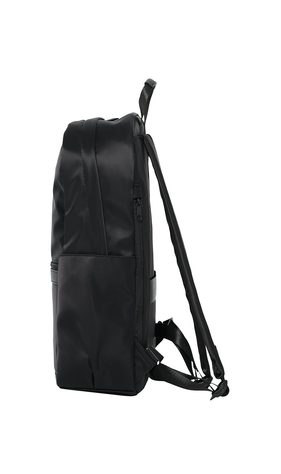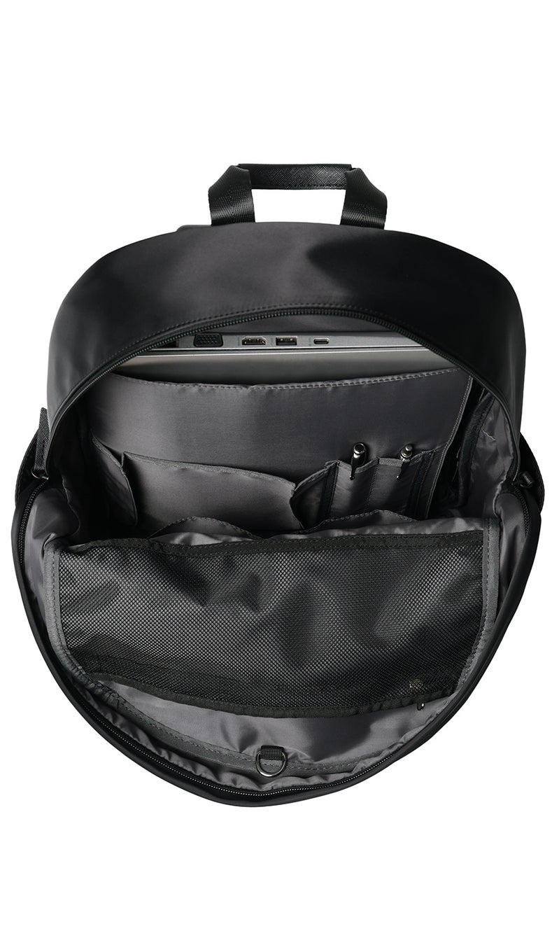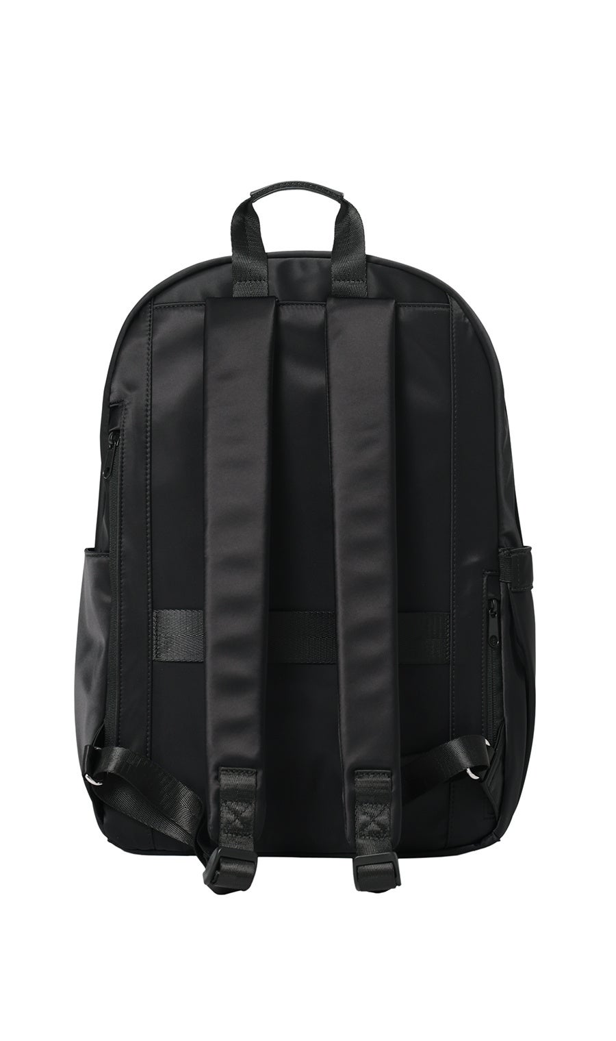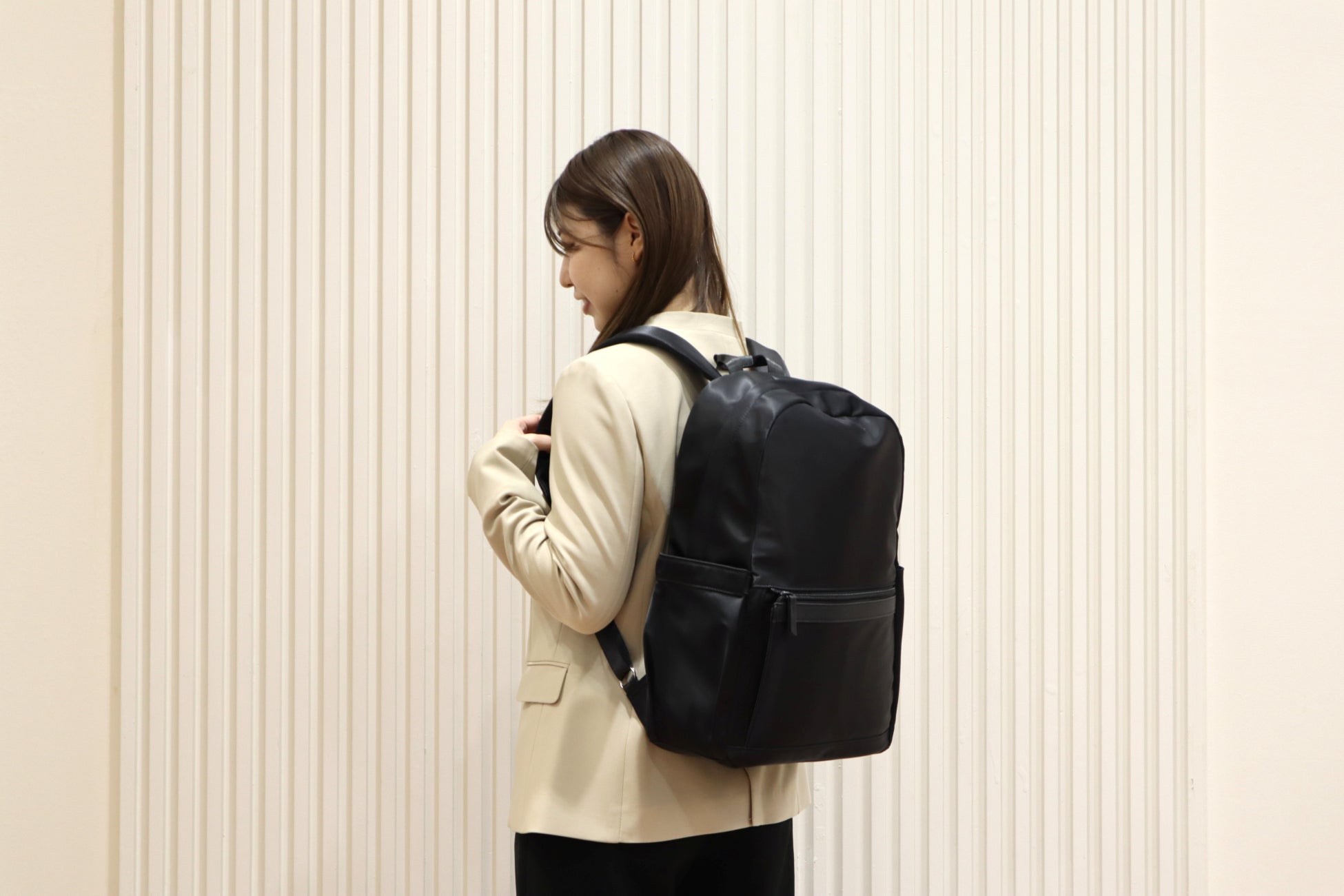 本商品は、安心して使えるシンプルかつコンパクト見えするデザインで、背中に馴染む絶妙な設計により、女性が背負ってもバランスの良いサイズ感になっています。ショルダー部分は、カジュアル見えしないような厚さと太さにこだわっていることに加え、バッグ表面のファスナー下にはサフィアーノ調素材を使用したラインをあしらうことで上品に仕上げました。メイン収納の上部には、取り外し可能な「ハンモックポケット」を搭載。おにぎりやサンドイッチなどリュックの中でつぶしたくないものを浮かせて収納できるポケットとなっています。その他、リュックを下ろさずに財布や定期を取り出せる背面ポケットを備えており、通勤や出張といったさまざまなビジネスシーンに活躍するリュックです。