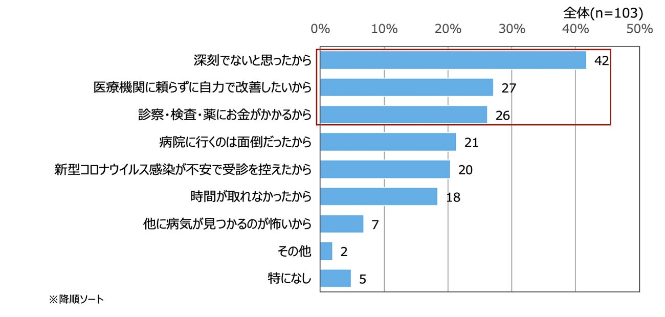 次いで、「医療機関に頼らずに自力で改善したいから」(27%)、「診察・検査・薬にお金がかかるから」(26%)が多かった。この結果から、医療機関にかからず自身の取り組みのみで改善できると考える人が多いのではないかと推察される。