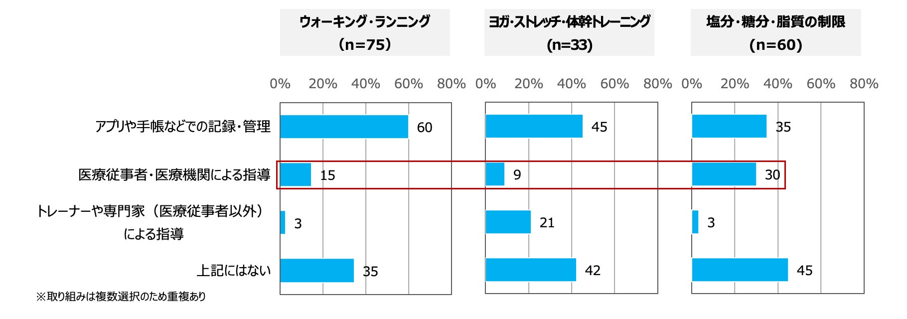 SNSに投稿する取り組みの上位3つについて、医療従事者・医療機関による指導を受けて取り組んでいる人の割合は、「ウォーキング・ランニング」で15%、「塩分・糖分・脂質の制限」で30%、「ヨガ・ストレッチ・体幹トレーニング」で9%であり、割合としては少なかった。