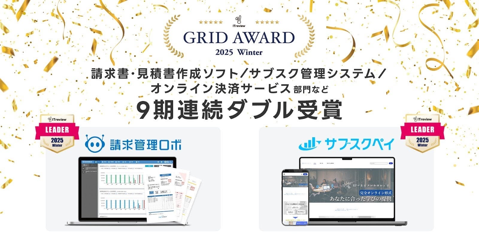 請求管理ロボ、サブスクペイが「ITreview Grid Award 2025 Winter」の最高位、『Leader』を9期連続ダブル受賞