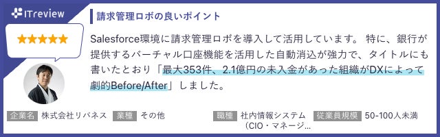 請求管理ロボでは、決済と紐づいた債権管理や請求業務の自動化ができる点や、カスタマーサポートが手厚い点において高評価を頂戴しております。