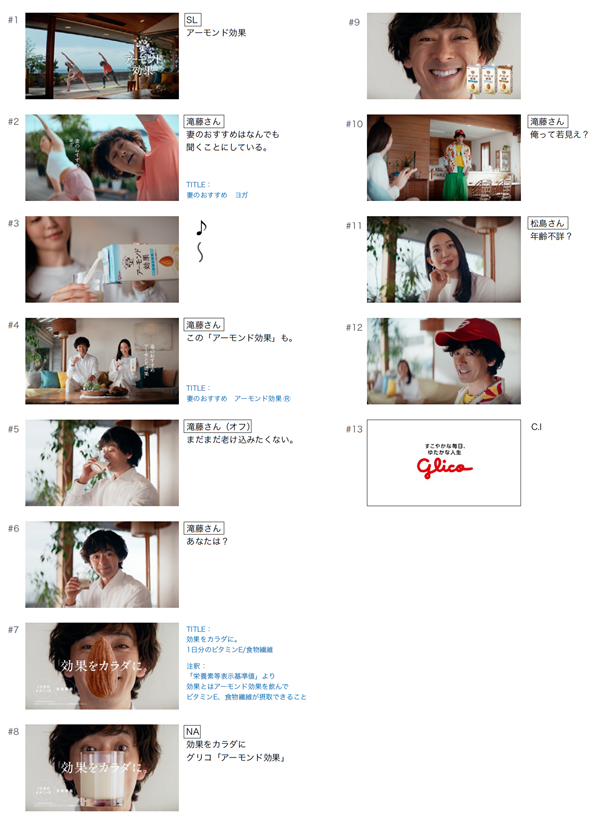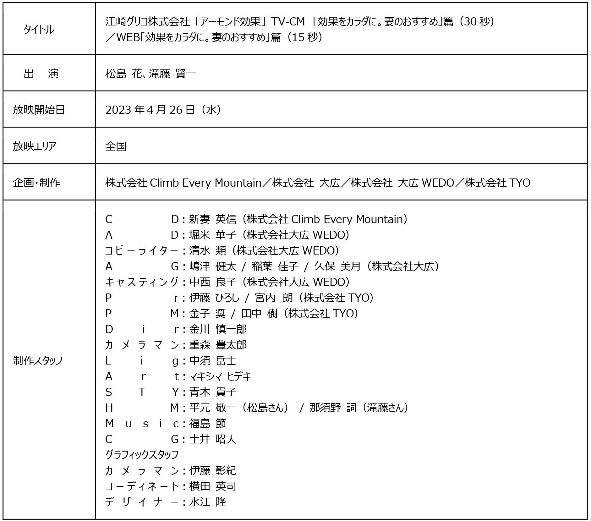 江崎グリコ株式会社は、モデル・女優として活躍されている松島花さんをCMキャラクターとして起用した「アーモンド効果」の新TV-CM「効果をカラダに。妻のおすすめ」篇(TV-CM 30秒/WEB 15秒)を2023年4月26日(水)より全国でオンエアを開始いたします。滝藤賢一さんが初出演し、松島さんと夫婦役を演じます。
