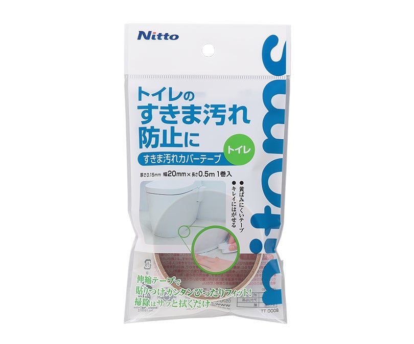 特長 | ・テープが透明で目立たず、トイレのすきまの汚れ防止ができる ・伸縮性があるので、便器のカーブにもフィットし、 ・作業時に貼り直しができ、位置がずれないように調整しながら貼れる ・圧着後は、しっかりくっつき、きれいにはがせる ・アンモニアが付着しても変色しないフィルムを基材に採用 |