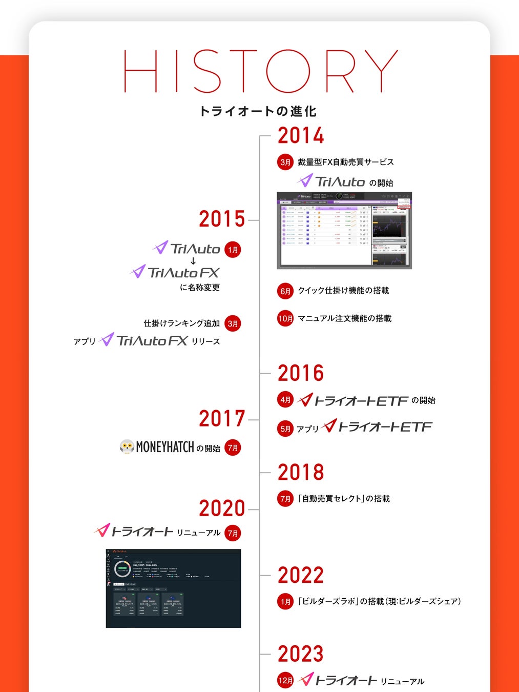 トライオートは2014年3月より「裁量型FX自動売買サービス」としてリリースされました。2016年4月には「トライオートETF」、2018年7月には選ぶだけで自動売買が始められる「セレクト」機能など、自動売買サービスに特化したサービスとして展開しています。