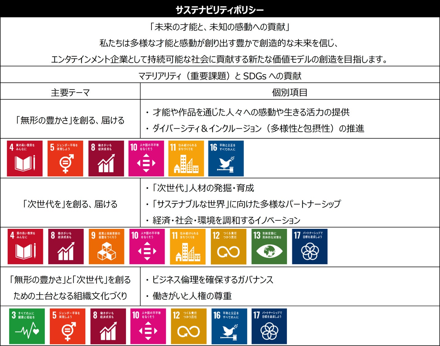当社は、これまでもコンプライアンスポリシーを遵守し、エンタテインメントを提供する事業を通じ、様々なサステナビリティ活動を展開してきました。この度策定したサステナビリティポリシーは、当社の企業理念「エンタテインメントの可能性に挑みつづける。人が持つ無限のクリエイティビティを信じ、多様な才能とともに世界に感動を届ける。そして、豊かな未来を創造する」を踏まえたものです。当社は、サステナビリティ推進を目的とした専門部署の設立をはじめ、エンタテインメント企業の強みを生かした「サステナブルな社会」の実現に向けた普及・啓発、次世代との協業と社会経験の提供、地域・コミュニティとのパートナーシップ強化、次世代型スマートライヴの推進などを通じて、サステナブルな社会の実現を目指します。