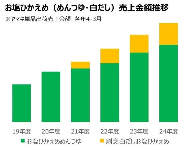 こうした社会的な状況を背景に、ヤマキは「鰹節屋・だし屋、ヤマキ。」として培ってきただしの技術を活かし、レギュラータイプの商品と変わらないおいしさを実現する『お塩ひかえめ』シリーズを展開してまいりました。これまでに「お塩ひかえめめんつゆ500ml」、「割烹白だしお塩ひかえめ500ml」、「お塩ひかえめうどんつゆの素6P」、「お塩ひかえめストレートそうめんつゆ500ml」などを発売・訴求し、指示を広げて減塩市場の拡大に取り組んできました。そしてこの度、ストレートつゆの中でも伸長傾向にあるそばつゆ領域において、「お塩ひかえめストレートそばつゆ500ml」を発売する運びとなりました。