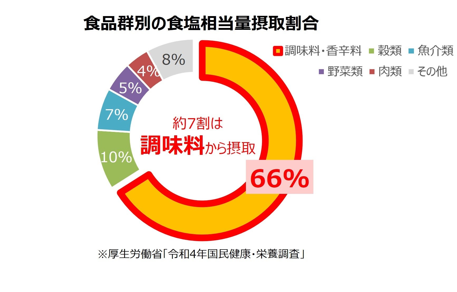 近年、健康意識の高まりを背景に、日常で無理なく続けられる「減塩」への関心が高まっています。一方で、日本人の1日当たりの食塩摂取量は依然として目標値を大きく上回っており、食塩摂取総量のうち、約7割(66%)が調味料からの摂取とされています。