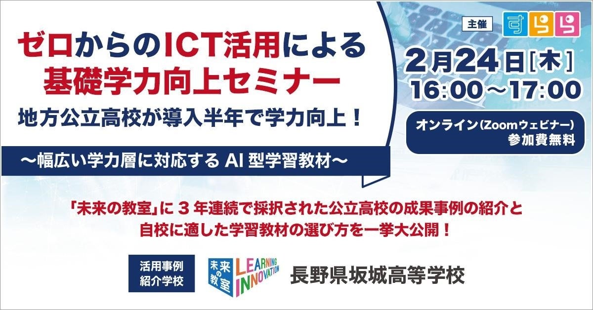 本セミナーでは、自校に適した学習教材の選定方法や、「未来の教室」に3年連続で採択され、生徒の学習への姿勢や意識の変化、学力の向上といった成果を創出した、長野県坂城高等学校の活用事例をお伝えいたします。