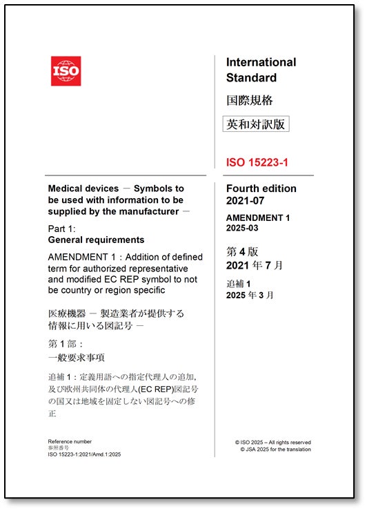 一般財団法人日本規格協会(本部:東京都港区、理事長:朝日弘)は、2025年4月15日(火)に「ISO 15223-1:2021/Amd 1:2025 追補1-医療機器-製造業者が提供する情報に用いる図記号-第1部:一般要求事項-認定代理人の定義用語の追加,及び欧州共同体の代理人(EC REP)図記号の国又は地域を固定しない図記号への修正」の邦訳(英・日対訳版)を発行いたしました。
