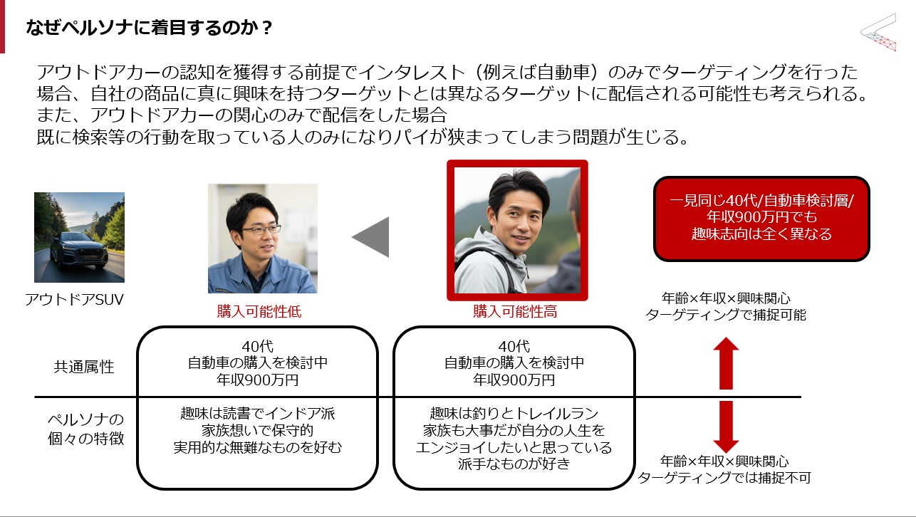 従来、詳細なペルソナ分析を行っても、実際に媒体のターゲティング配信に変換する際、解像度の低いアフィニティターゲティング*¹を代替して使用するケースがありました。