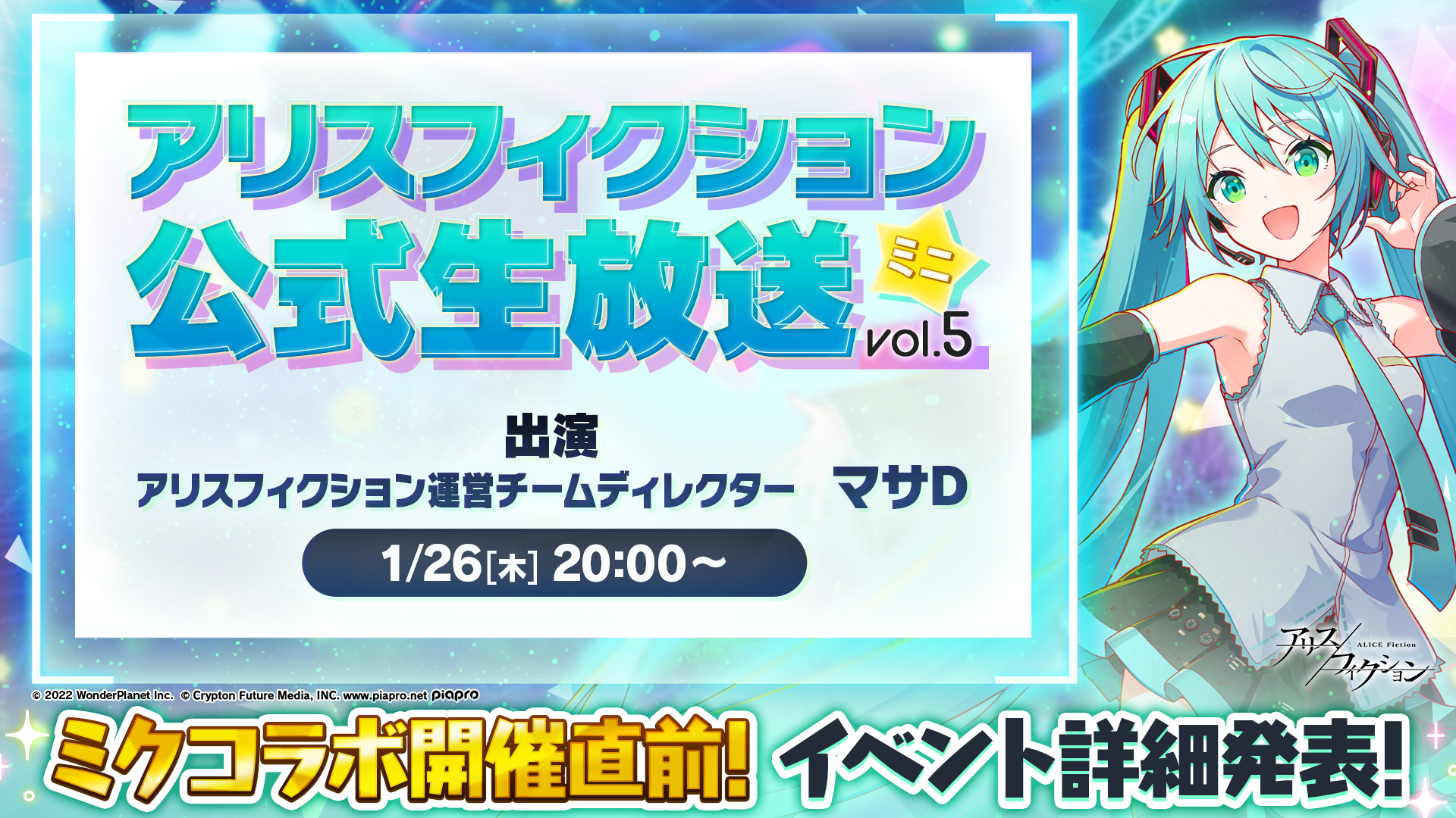 ■『アリスフィクション』×『初音ミク』コラボ情報先行公開!1月26日(木)20時より『アリスフィクション公式生放送ミニ vol.5』を生配信!