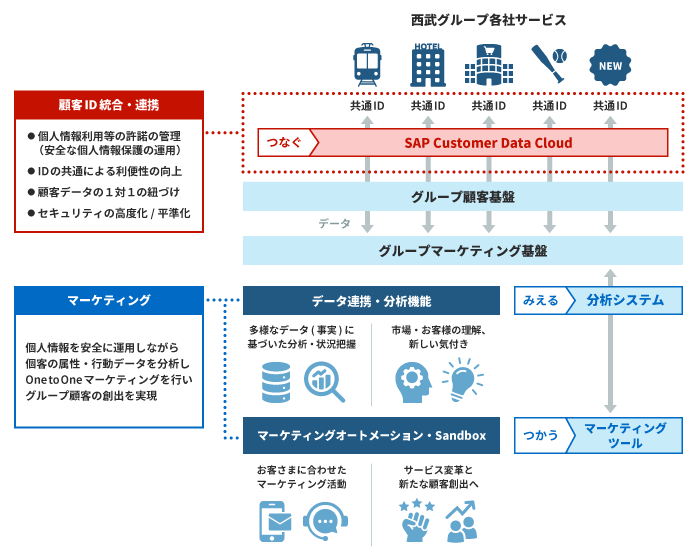 西武ホールディングスでは、グループとして鉄道、ホテル・レジャー、不動産等多岐に渡るビジネスを展開しているため、サービスを横断した利用促進や、顧客データの活用によるお客さまに寄り添ったOne to Oneマーケティングの実現を目指していました。