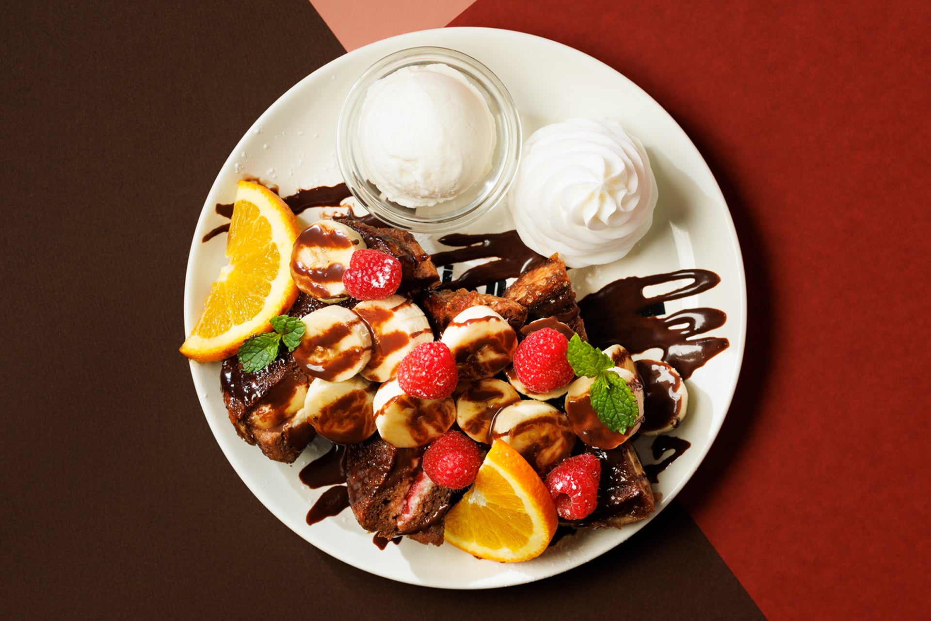 マスカルポーネ、バナナ、ラズベリージャムをサンドしたパンをチョコアパレイユに浸して焼き上げたフレンチトースト。バナナ、チョコソース、さらにオレンジやラズベリーなどトッピングしました。