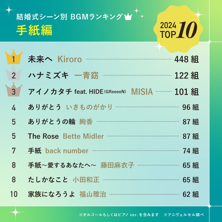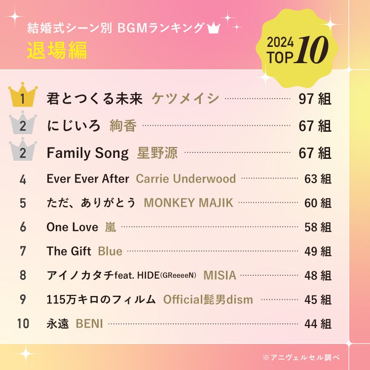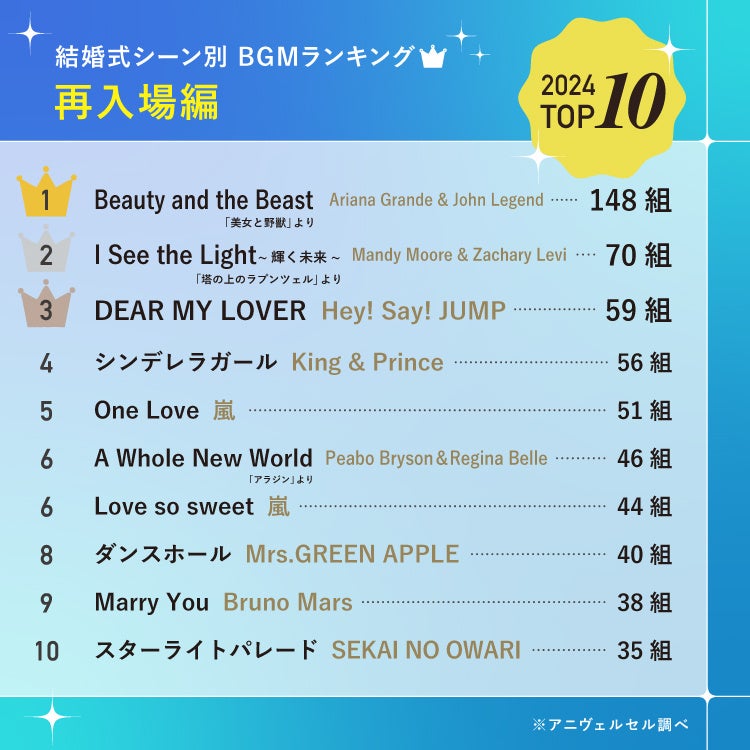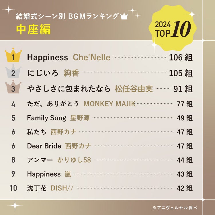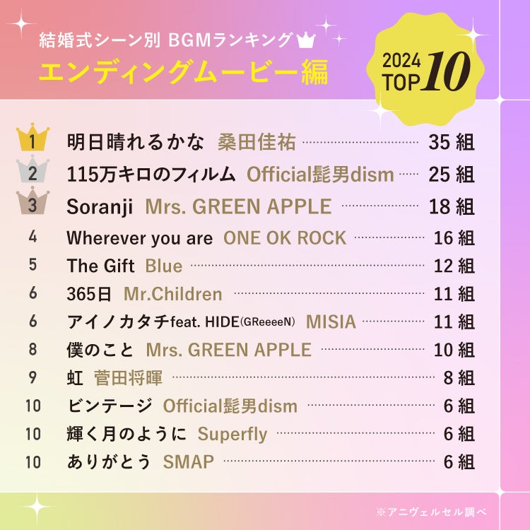 2024年にアニヴェルセルの結婚式で使用された全楽曲から選ばれた総合ランキングは以下の通りです。
