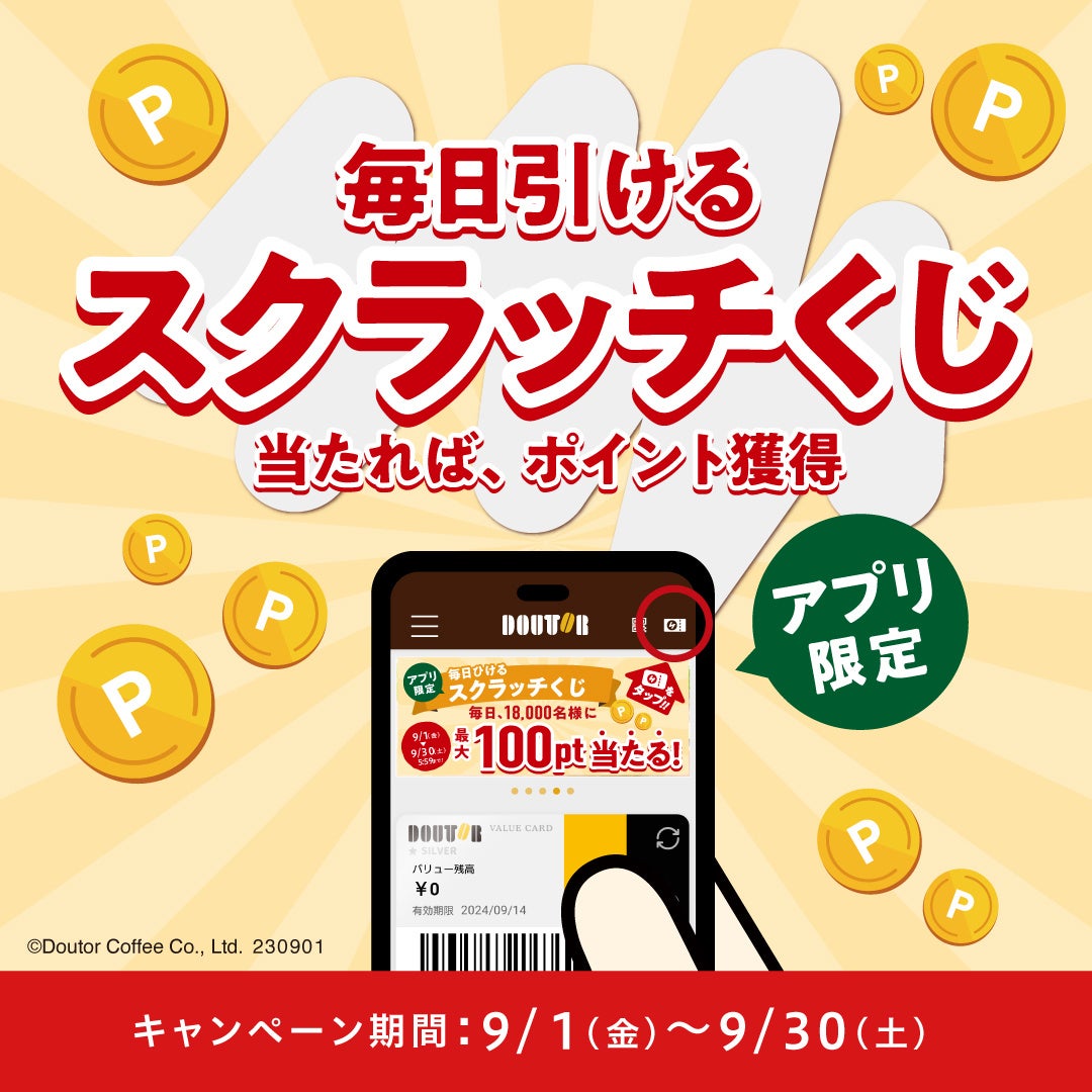 また同期間中に、ドトール バリューカードアプリ限定で毎日18,000名様にドトール バリューポイントが当たる!「毎日引けるスクラッチくじ」を開催。ドトール バリューアプリの登録がまだの方は、この機会にぜひ登録しておトクなキャンペーンにご参加ください。