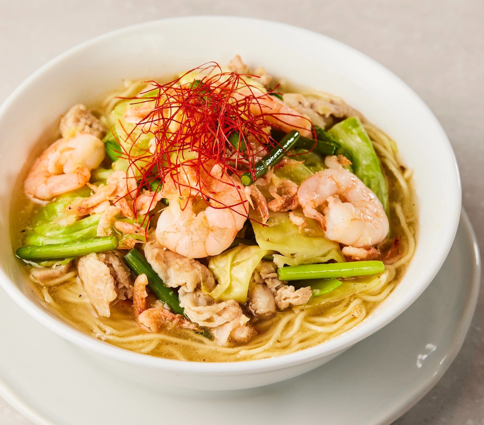 鶏ガラスープを長時間煮込んだ桜海老の出汁と香りを存分に楽しめる絶品スープ。そこに炒めた季節野菜とプリプリの海老を乗せた贅沢な一品です。