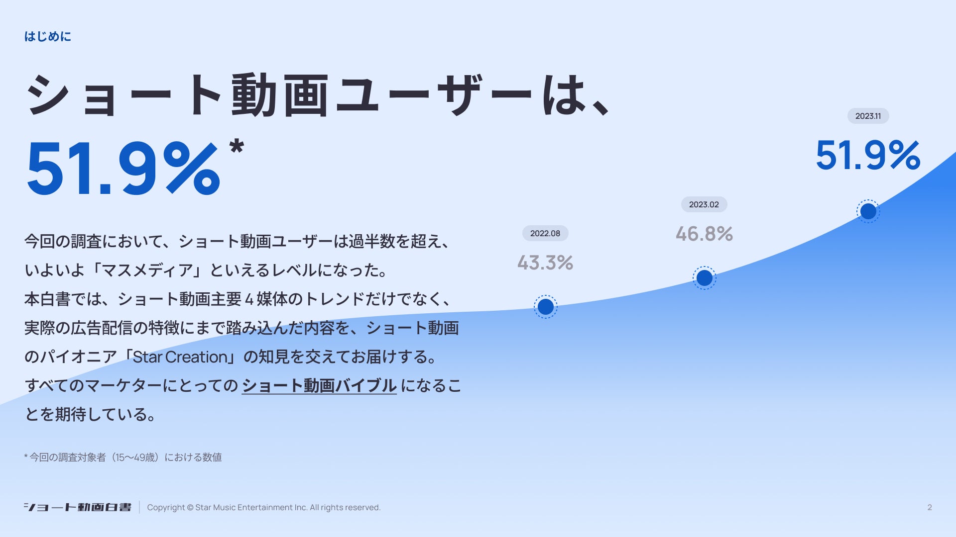ショート動画白書 vol.3では、「2024年、ショート動画はマスメディアに。」と題し、ショート動画主要4プラットフォームのトレンドだけでなく、最新のショート動画市場の動向や消費者にどの程度浸透しているのか、実際の広告配信の特徴にまで踏み込んだ内容を、ショート動画のパイオニア 「Star Creation」 の知見を交えてお届けします。