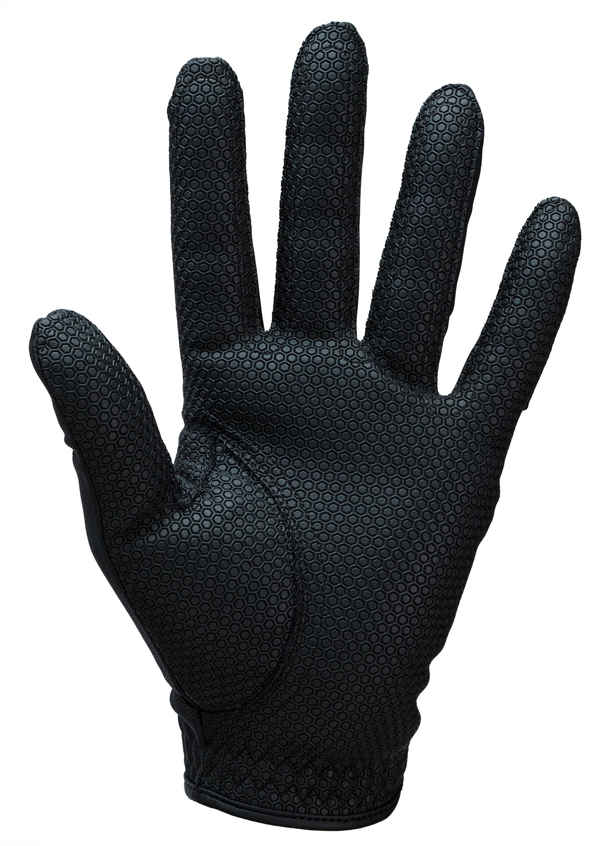 商品の構造・機能・素材は、手のひら側の合成皮革を2層に重ね合わせることで「約1㎜」の厚さとし、外側はグリップ力を高めるためエンボス加工合成皮革、内側は滑らかな手入れ感を持たせるため風合いの良いスエード調合成皮革を採用しています。その厚手構造が手とグリップの隙間を埋めることでクラブとの一体感が増し、力みなくしっかり握れることが期待できます。また、フィット性と通気性を確保するため、指・手の甲の屈曲部には、伸縮性のあるニットを配置し、厚手でも快適な着用感を追求しています。