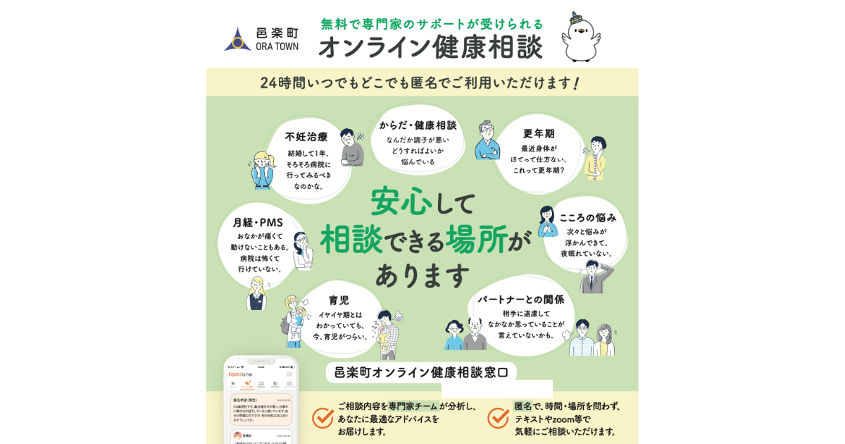 群馬県邑楽郡邑楽町の『オンライン健康相談事業』として、「ファミワン」の提供を今年度も継続します