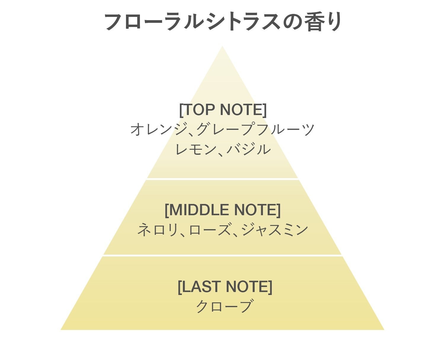 やすらぎ感のあるオレンジやグレープフルーツなどのシトラス系をベースに、ネロリやローズなどのフローラル系をブレンド。そこへハーブのアクセントを加え、爽やかさや透明感がありながらもリラックス感のある香り。