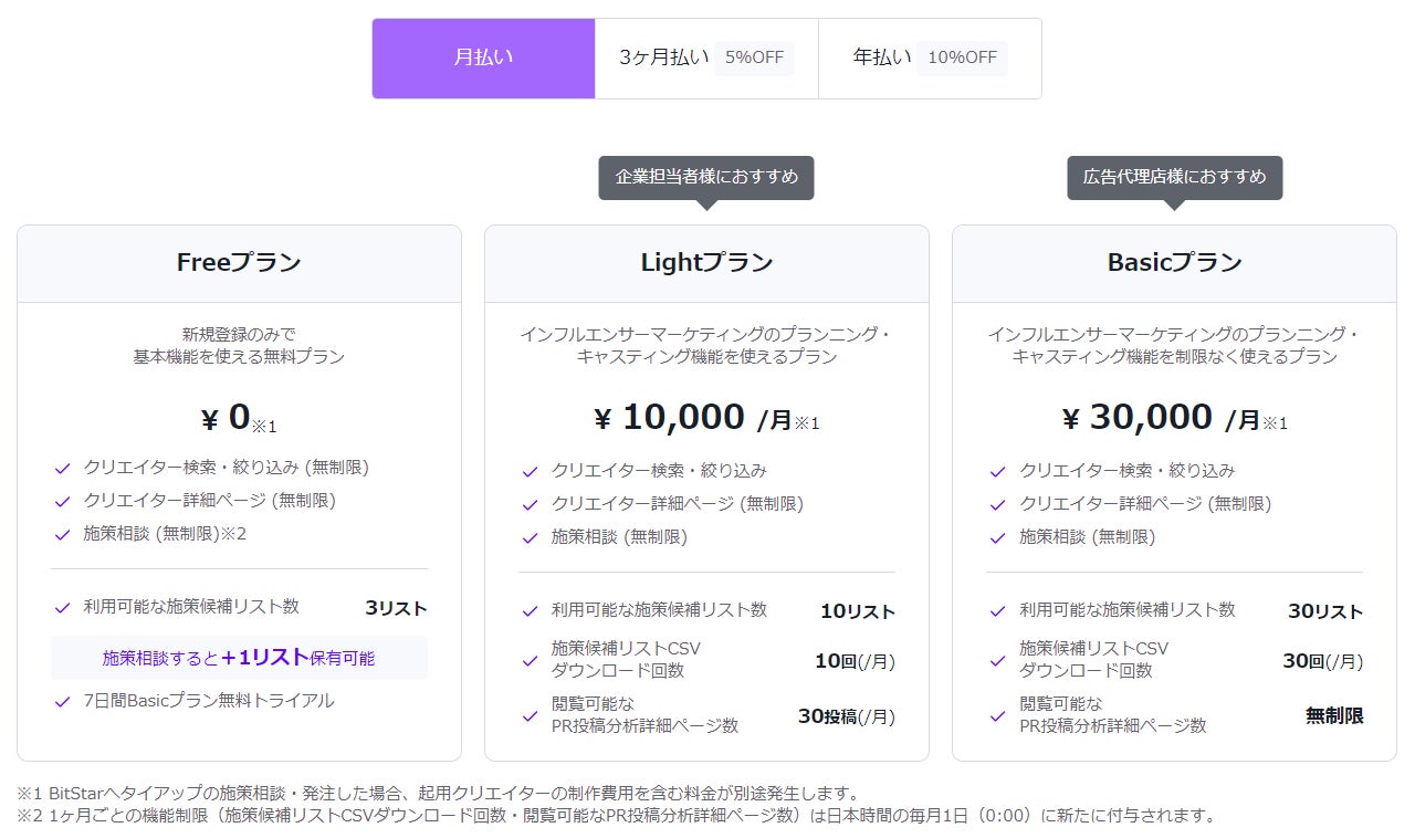 ※無料プランでのインフルエンサー選びでは料金は発生しません。BitStarへの施策相談・発注以降、起用クリエイターの制作費用を含む料金が発生します。