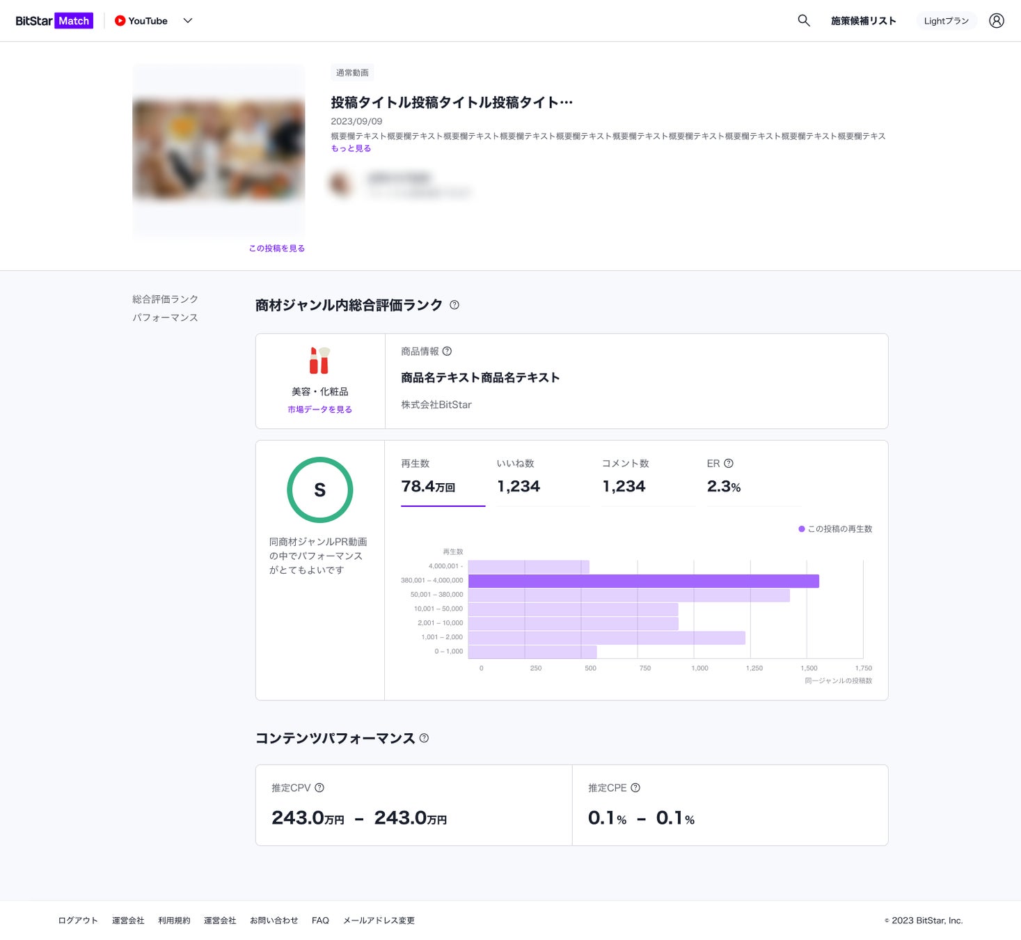 「PR投稿分析機能」は、YouTube・Instagramにて分析したいPR投稿を選択することで、同ジャンルのPR投稿の中でのパフォーマンスを自動評価します。
