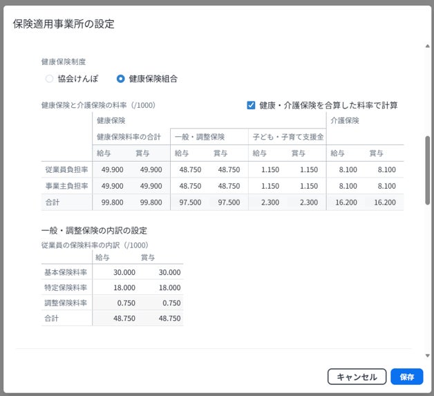 協会けんぽについては料率を自動で設定し、健康保険組合については必要な料率を入力することで対応可能です。
