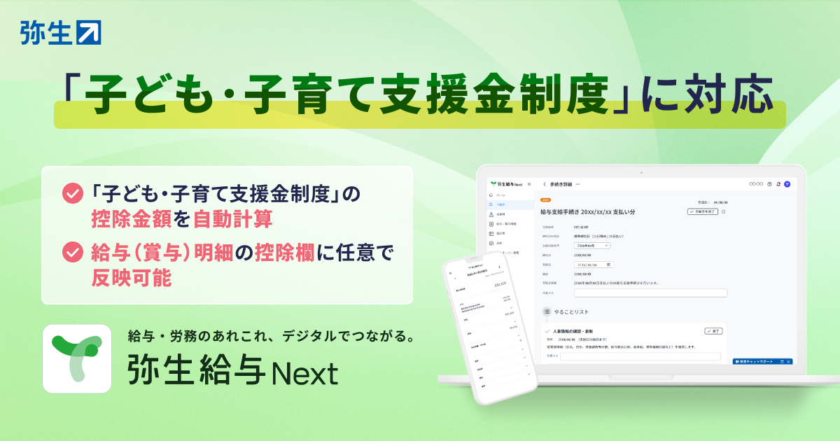弥生株式会社(本社:東京都千代田区、代表取締役 社長執行役員 兼 CEO:武藤健一郎、以下「弥生」)は、提供するクラウド給与サービス「弥生給与 Next」において、2026年4月分の保険料から徴収が開始される「子ども・子育て支援金制度」の法令改正に対応した機能をアップデートしたことをお知らせします。