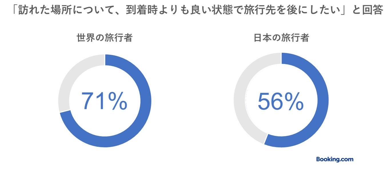 世界の旅行者の71%(日本の旅行者:56%)が「訪れた場所について、到着したときよりも良い状態で旅行先を後にしたい」と回答しており、45%(日本の旅行者:35%)が「旅行が環境に与える影響に対して、自ら働きかけることができる」と考えています。