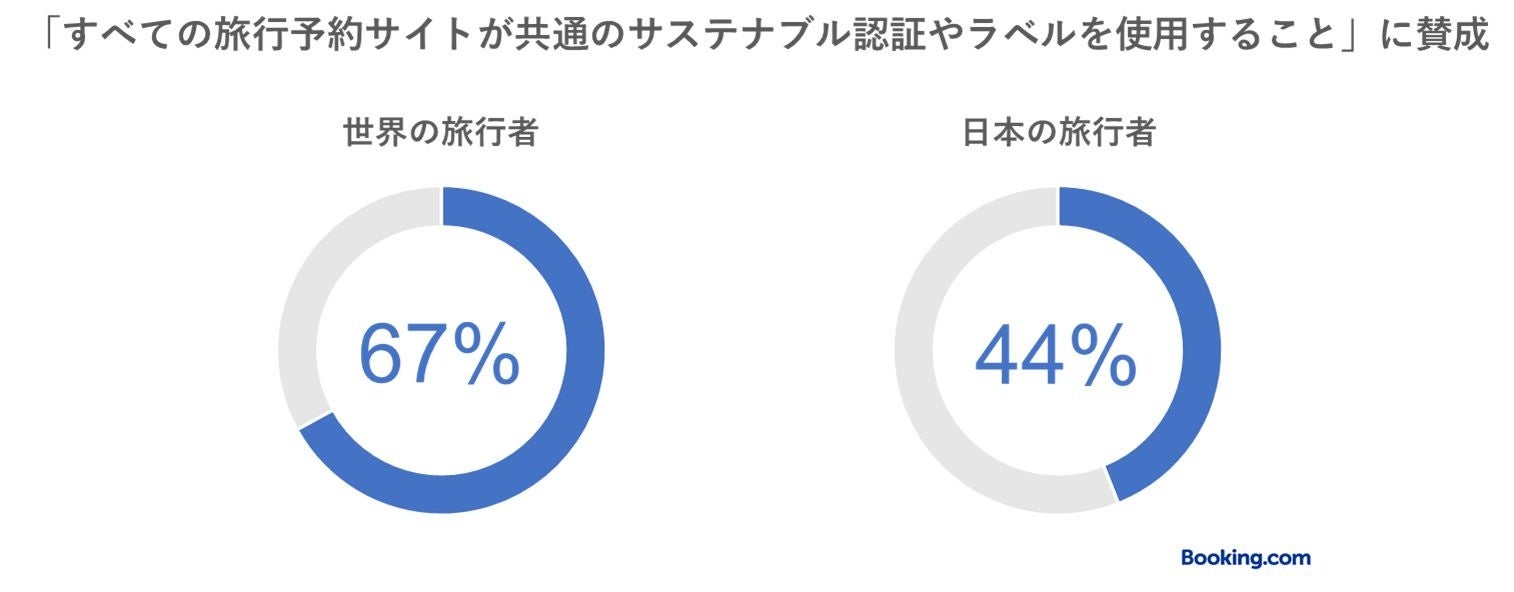 「よりサステナブルな宿泊施設に魅力を感じる」世界の旅行者は、ほぼ半数(45%、日本の旅行者:36%)に上ります。そのため、一貫した認証基準を定めることが宿泊施設を判断するうえで重要です。実際、67%(日本の旅行者:44%)が「すべての旅行予約サイトが共通のサステナブル認証やラベルを使用すること」に賛成しています。