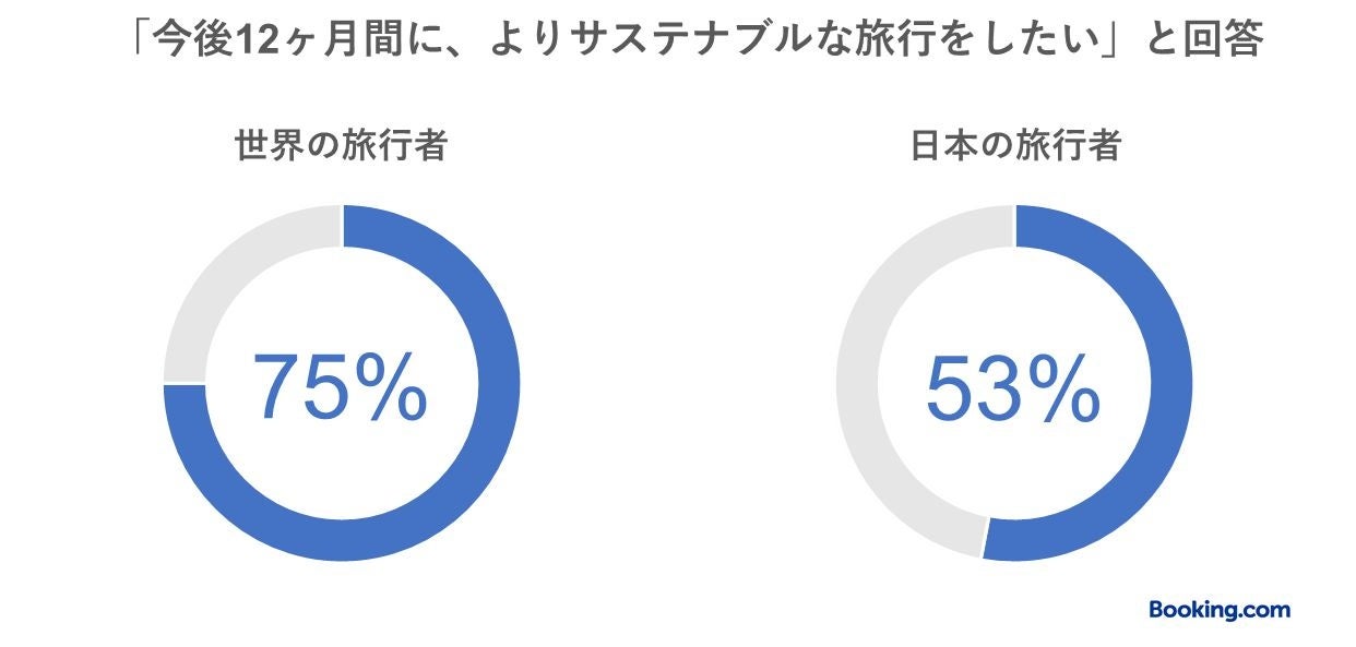 ●世界の旅行者の75%(日本の旅行者:53%)は「今後12ヶ月間に、よりサステナブルな旅行をしたい」と回答。多くの旅行者がサステナブルな旅行への関心が高いことがうかがえる。