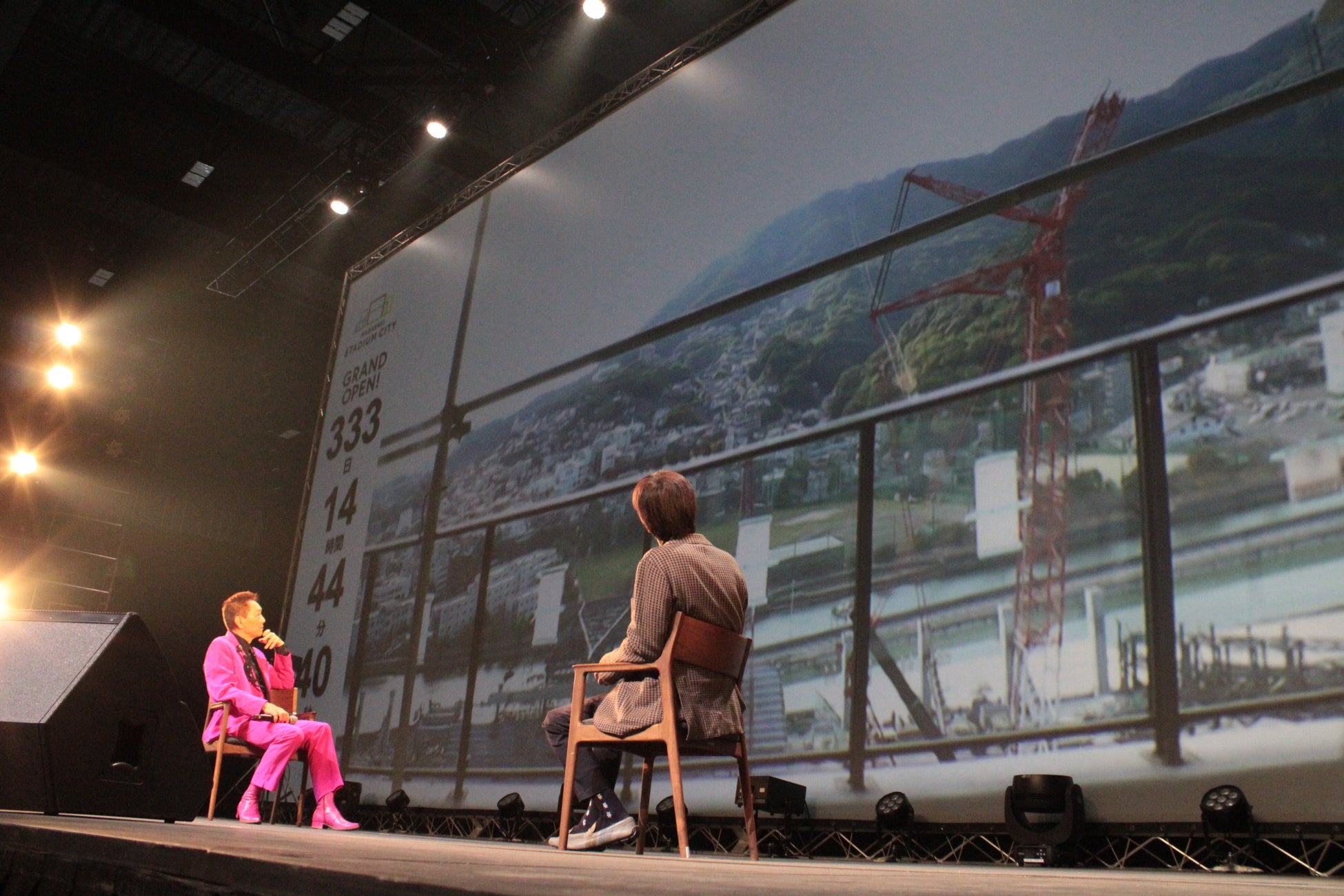 長崎スタジアムシティの建設現場を訪れた錦野さんに密着した映像を見ながら、会場でトークを展開。