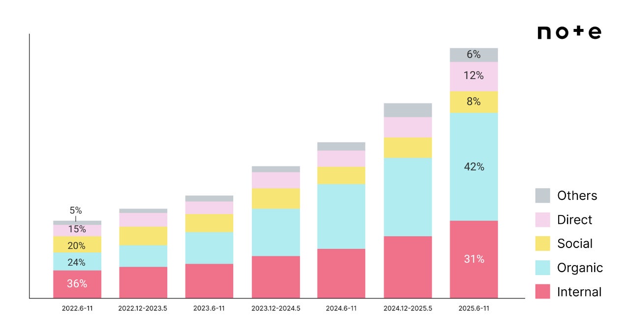 AI時代だからこそ、ひとが書いたコンテンツを求める読者は増えています。実際にnoteの記事のPV数(*2)は、3年間で3.2倍に増加しました(2022年6〜11月と2025年6〜11月の比較)。記事の流入元の73%を占めるのは、note内の回遊と検索流入です。この3年でSNS経由は20%から8%に下がる一方、記事そのものの力で読者が集まる構造になっています。この流れをさらに加速させるために、note内で記事をおすすめする仕組みそのものを進化させる必要がありました。