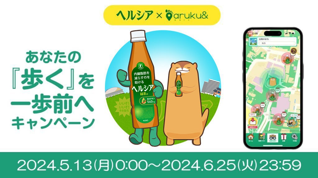 ウォーキングアプリ「aruku&」は、花王の健康的な生活を応援する「ヘルシア」とのコラボキャンペーンを開催します。このキャンペーンは、“あなたの一歩が宝にかわる”というブランドコンセプトを持つ「aruku&」と、“ヘルシーをアシストする”という「ヘルシア」のブランドコンセプトが組み合わさることで、気軽に運動習慣を身につけたい方やさらに健康意識を高めたい方の取組みを応援し、これから運動を始める方のきっかけづくりになることを目指して実現しました。地図上に現れる住民キャラクター「ヘルシアくん」たちの依頼達成で獲得できる「応募カード」を集めると、抽選で「ヘルシア緑茶 350ml スリムボトル3本セット」や指定店舗・ECサイトで使えるクーポンが当たるプレゼントに応募できます。また、ヘルシアの公式LINEと友達になり合言葉を送ると、aruku&のアプリ内通貨「ポタストーン」がもれなく100個もらえます。