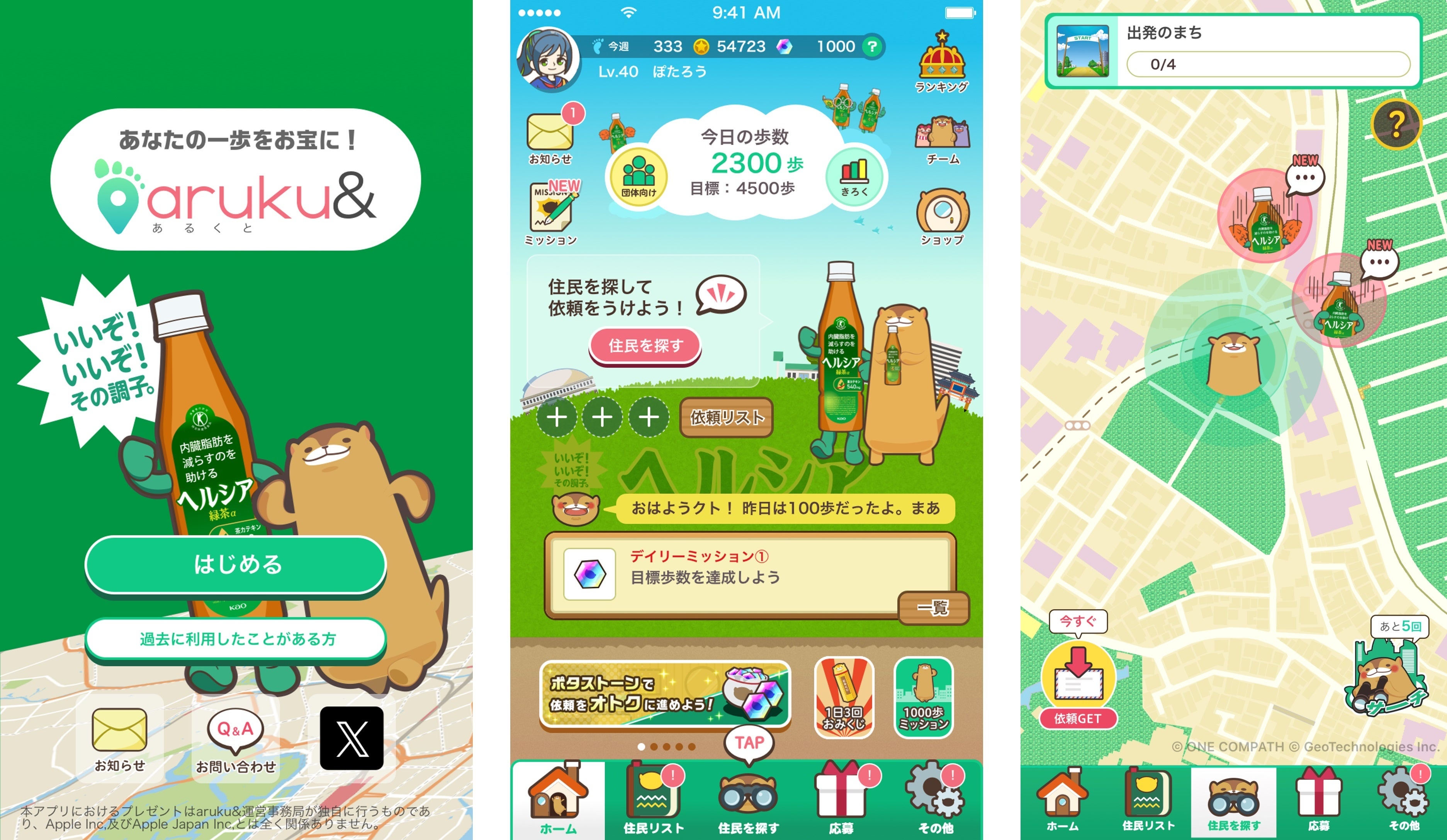 aruku&アプリ内の地図上にランダムでヘルシアキャラクターの「ヘルシアくん」をはじめ、3種が住民として登場。キャラクターに話しかけ、依頼された歩数(例:3時間以内に1000歩あるく)を制限時間内に達成すると応募カードがもらえます。応募カードをあつめると、「ヘルシア緑茶 350ml スリムボトル3本セット」や、指定店舗・ECサイトでお得にヘルシアを購入できるクーポンが抽選で合計6,100名(ヘルシア緑茶3本セット 600名様、クーポン5,500名様)にあたります。