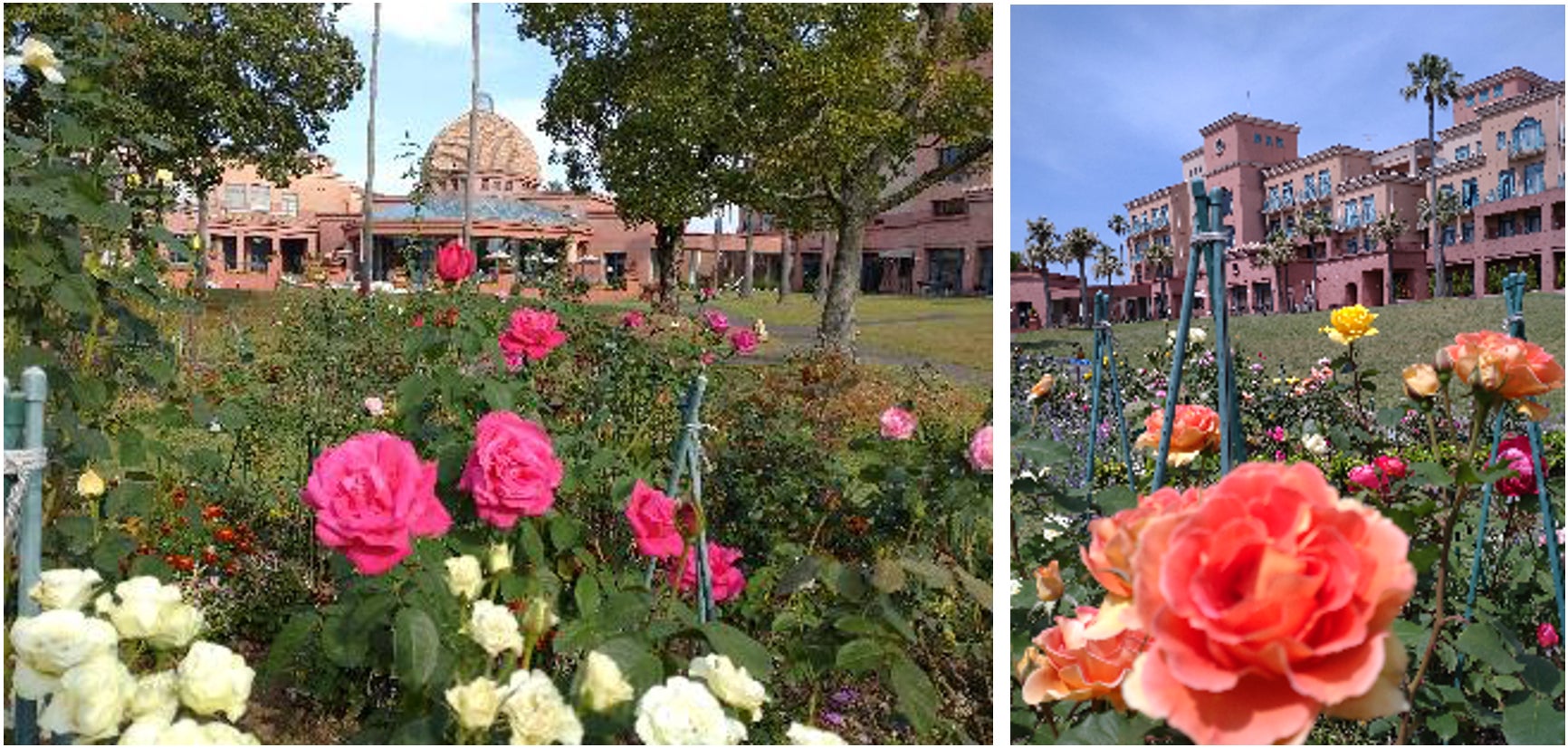 オールインクルーシブのおもてなしや、西海橋と海を望むダイナミックな空間で楽しむグルメバイキングなど「非日常気分を満喫した!」とお客様の声を頂戴していますが、そんな「非日常のひととき」に華を添えているのが、ずばり、中庭のバラ。
