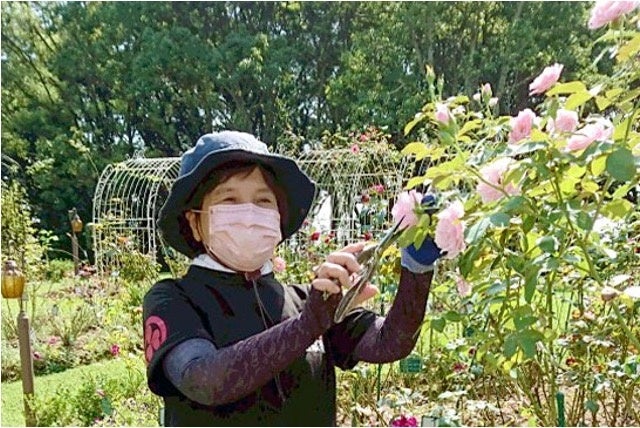 害虫の駆除や除草、夏は長崎・佐世保の照り付ける日差しやトゲと格闘しながら、約450平方メートルのバラ園の手入れを行います。