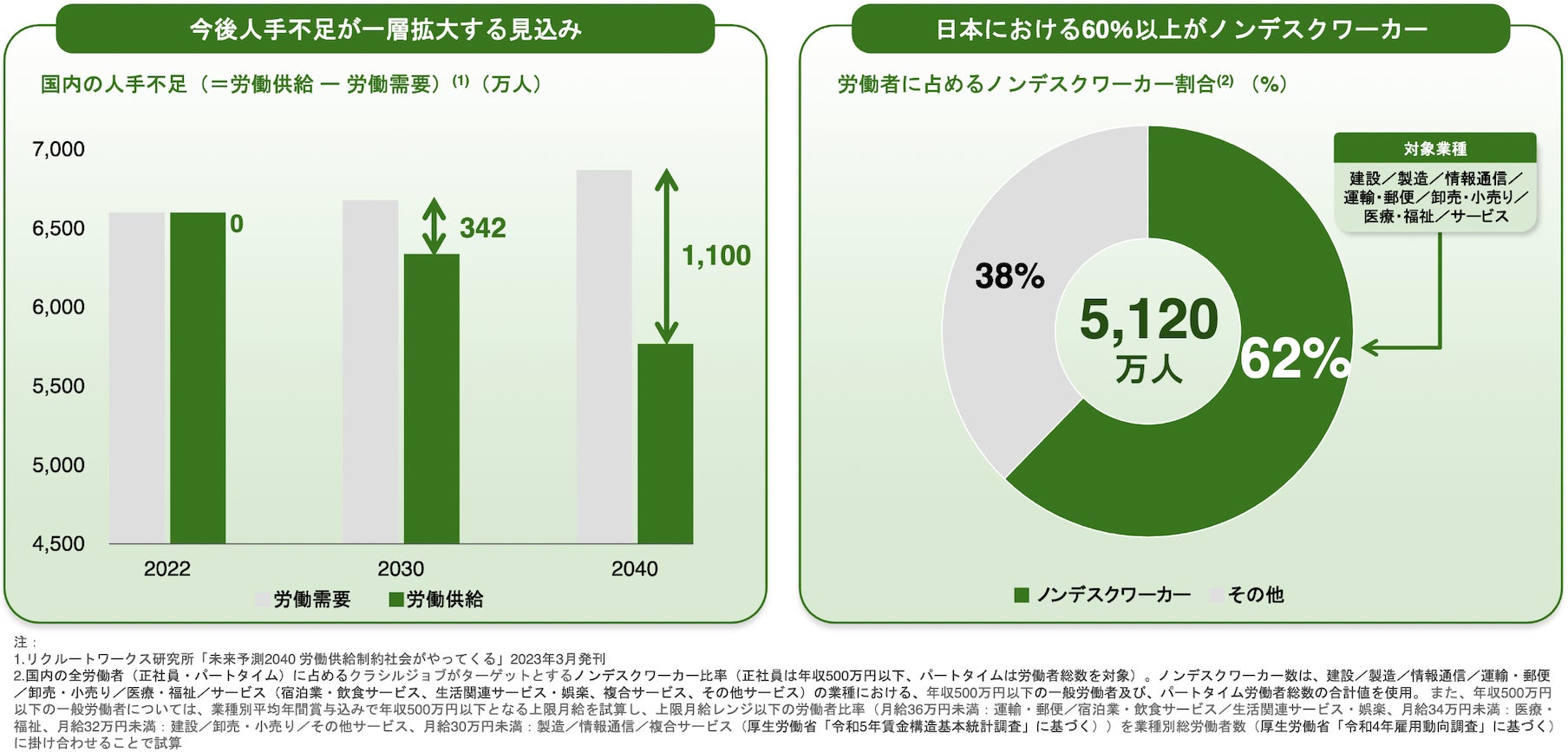 日本では、労働需要の増加に反して労働者人口が急激に減少しており、人手不足は2030年に342万人、2040年には1,100万人と、今後、一層拡大すると見込まれています(1)。