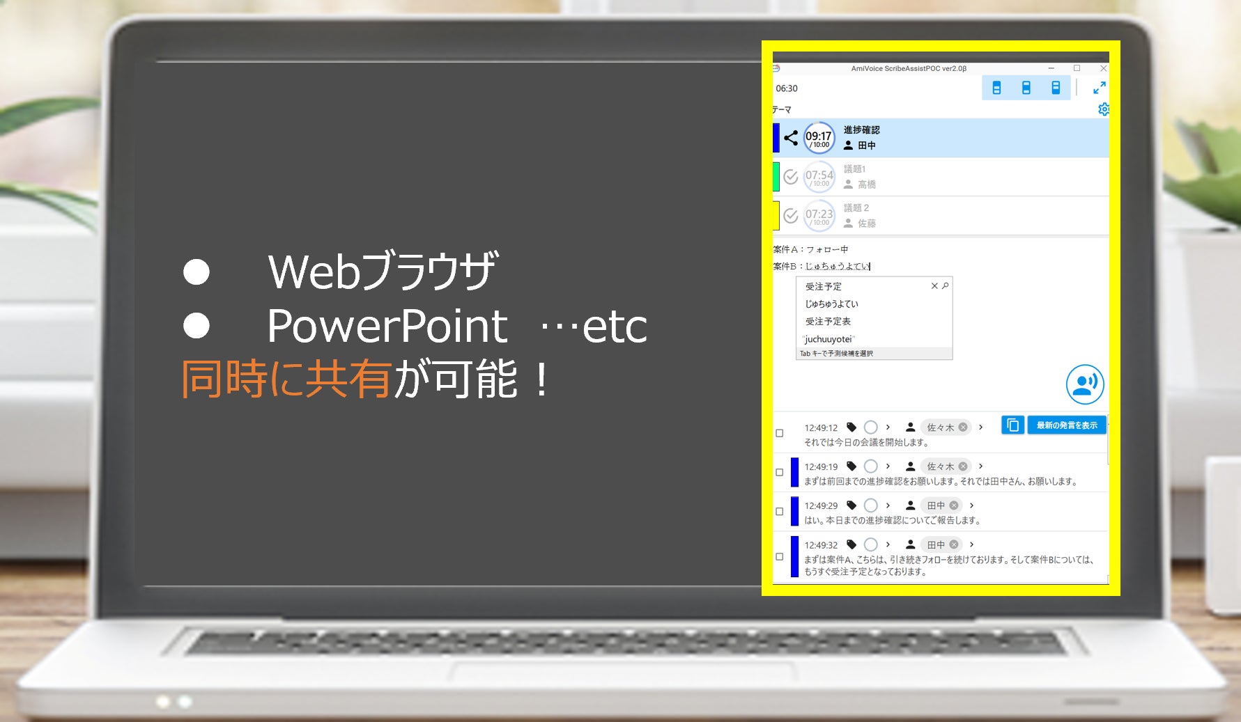 「AmiVoice ScribeAssist」の画面をコンパクトにまとめ、画面共有中のWebブラウザや資料などと並べて表示することが可能です。資料とアジェンダ、音声認識結果、議事録メモを同時に確認できるため、会議をスムーズに進行できます。