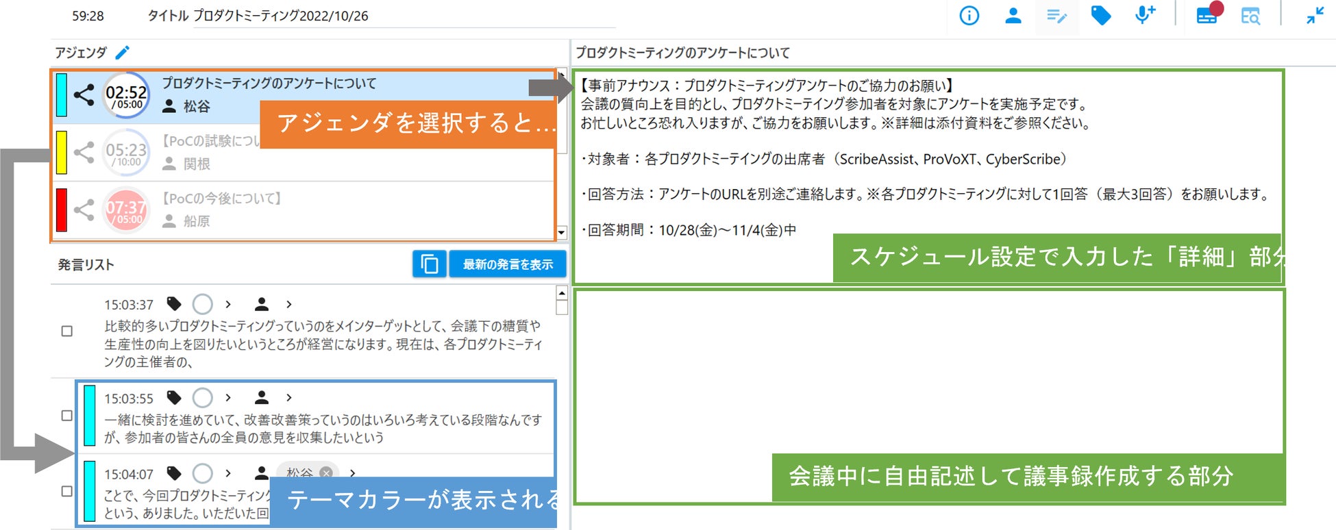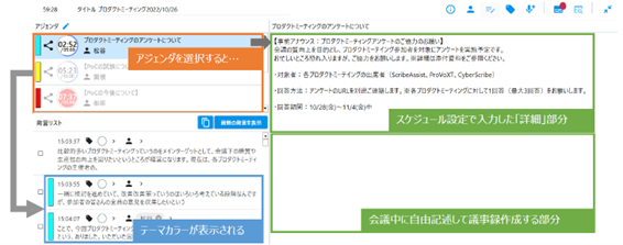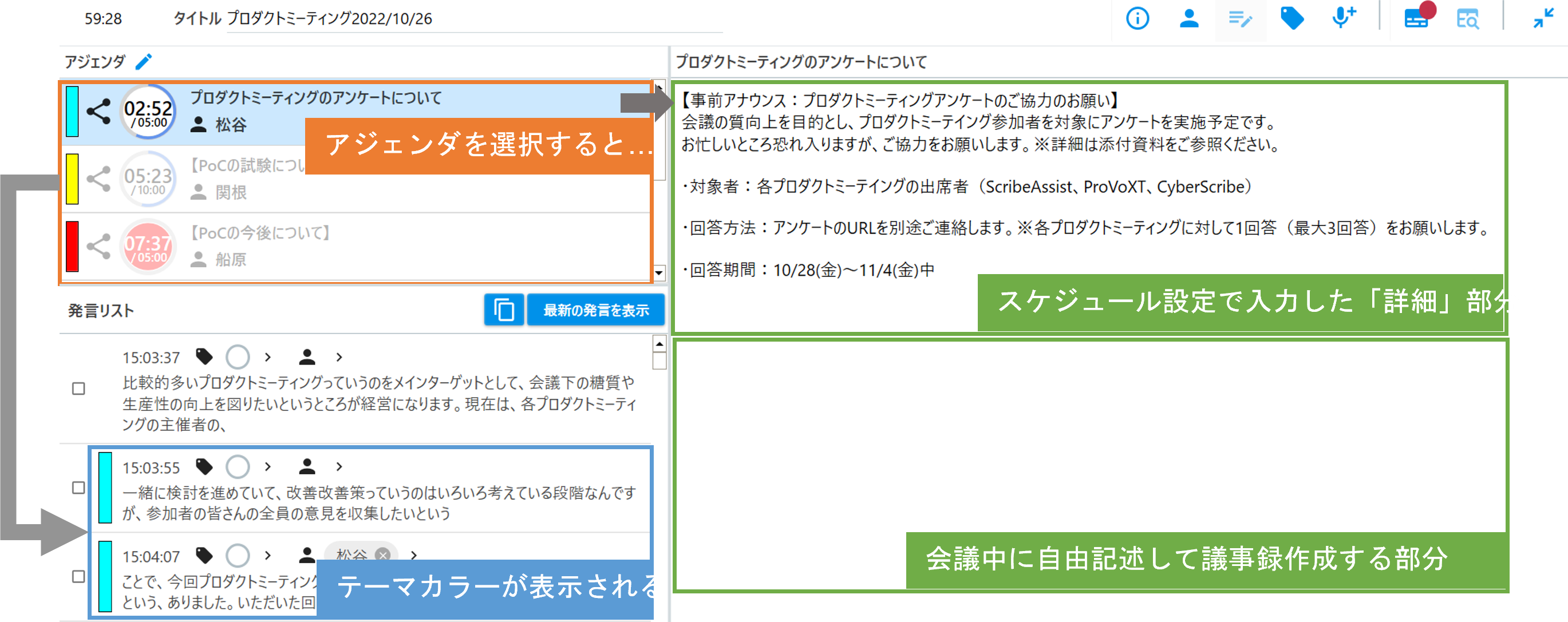 事前に登録した目的・詳細・担当者・時間をアジェンダとして表示し、会議の進行をサポートします。会議中に都度、議題(テーマ)を選択すると発言リスト上に対象のテーマカラーが表示され、どの議題に関する発言か一目で確認できます。