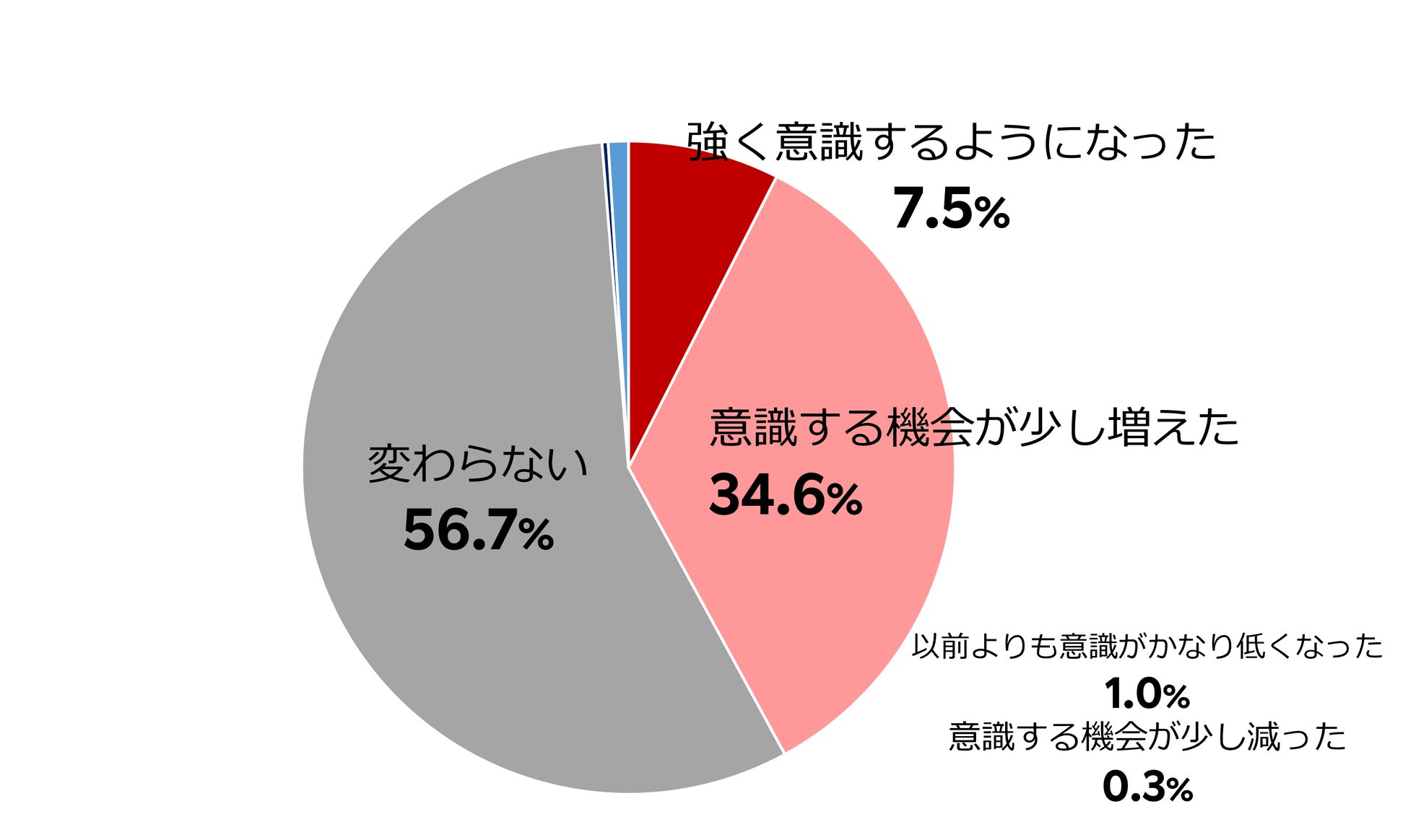 ・直近3年間(注1)において旅行をする際のサステナビリティへの意識の変化をたずねたところ、「以前よりも強く意識するようになった」が7.5%、「意識する機会が少し増えた」が34.6%となり、以前よりも意識が増したとの回答が4割超に上った。「変わらない」は56.7%。「以前より意識がかなり低くなった」「意識する機会が少し減った」と回答した人の合計は1.3%だった。