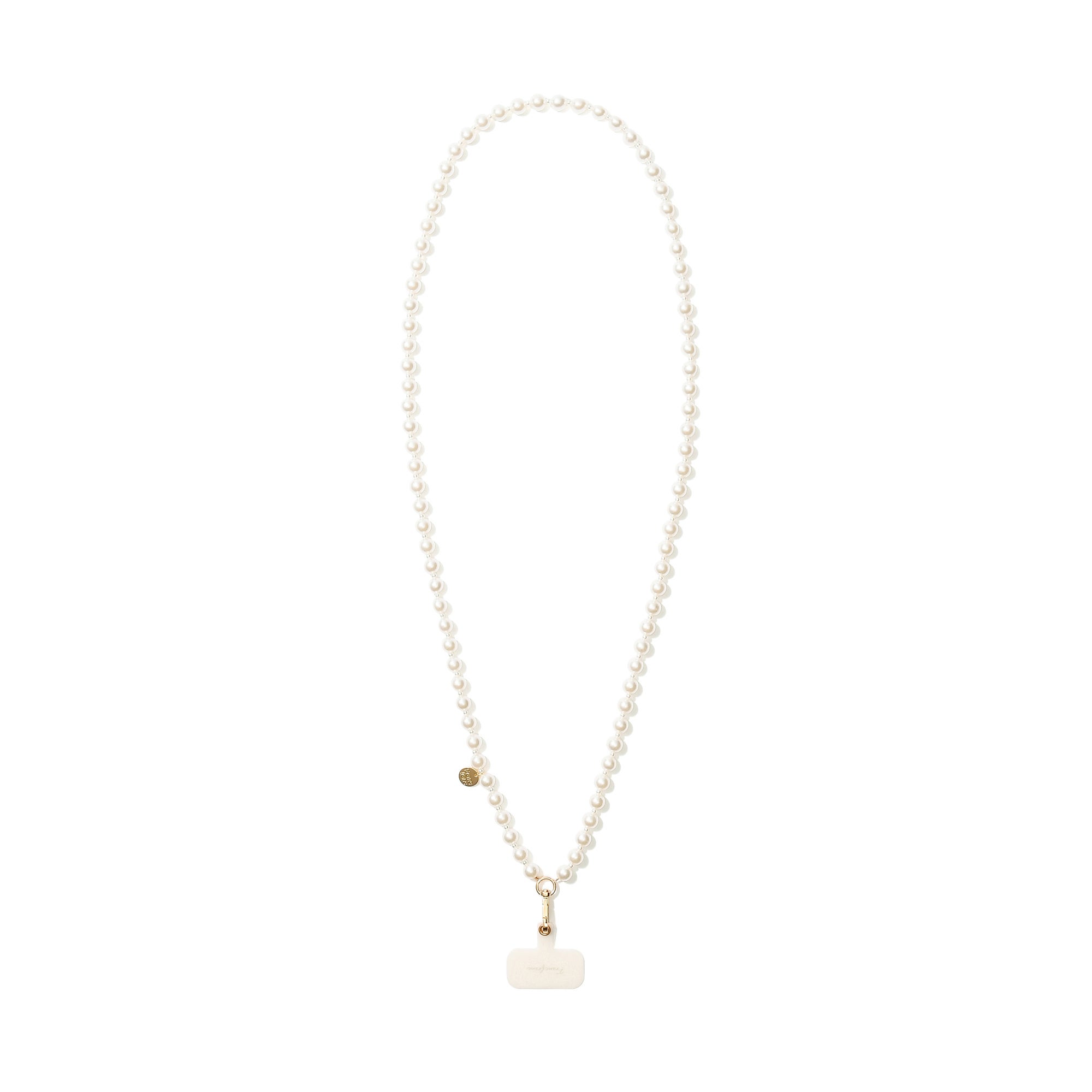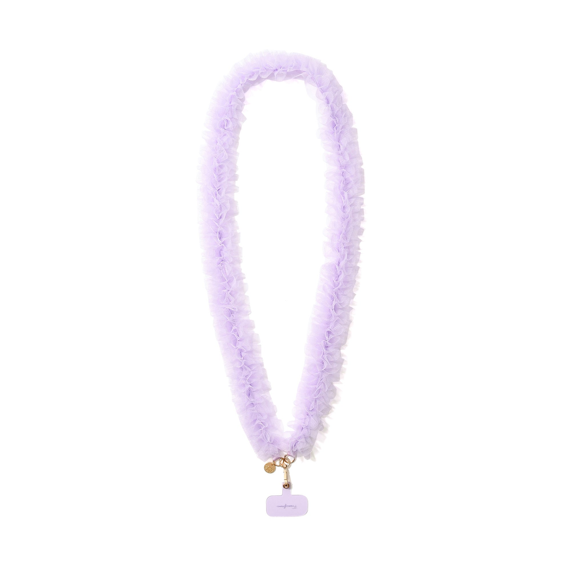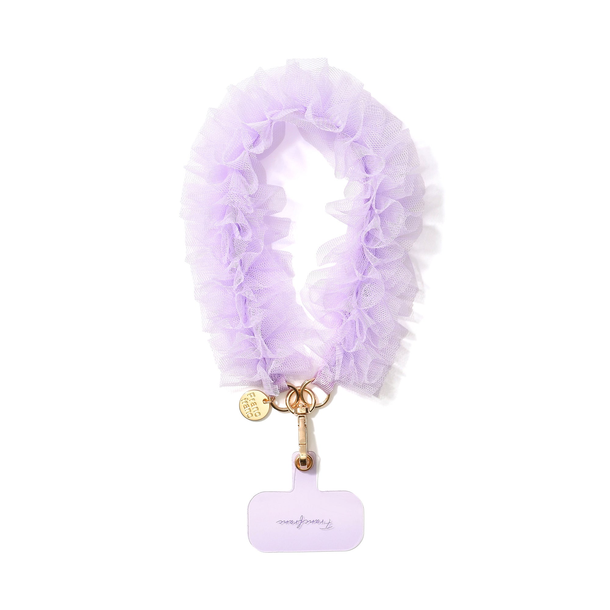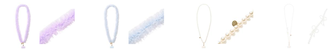 スマートフォンに付けることができるネックストラップです。トレンド感のある素材でコーディネートのポイントになるチュール、高級感を演出できるパール、華奢で小さなパールに小さなリボン結びがついたキュートなデザインのパールリボンを展開します。スマートフォンケースの間に先端部分のシートを挟むことで取り付け可能です。