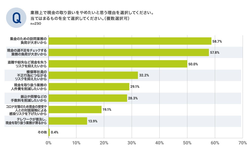 現金の取り扱いをやめたい理由としては、1位「集金のための訪問業務の負荷が大きい」(58.7%)、2位「現金の過不足をチェックする業務の負荷が大きい」(57.8%)、3位「盗難や紛失など現金を失うリスクを押さえたい」(50.0%)がいずれも半数以上となった。