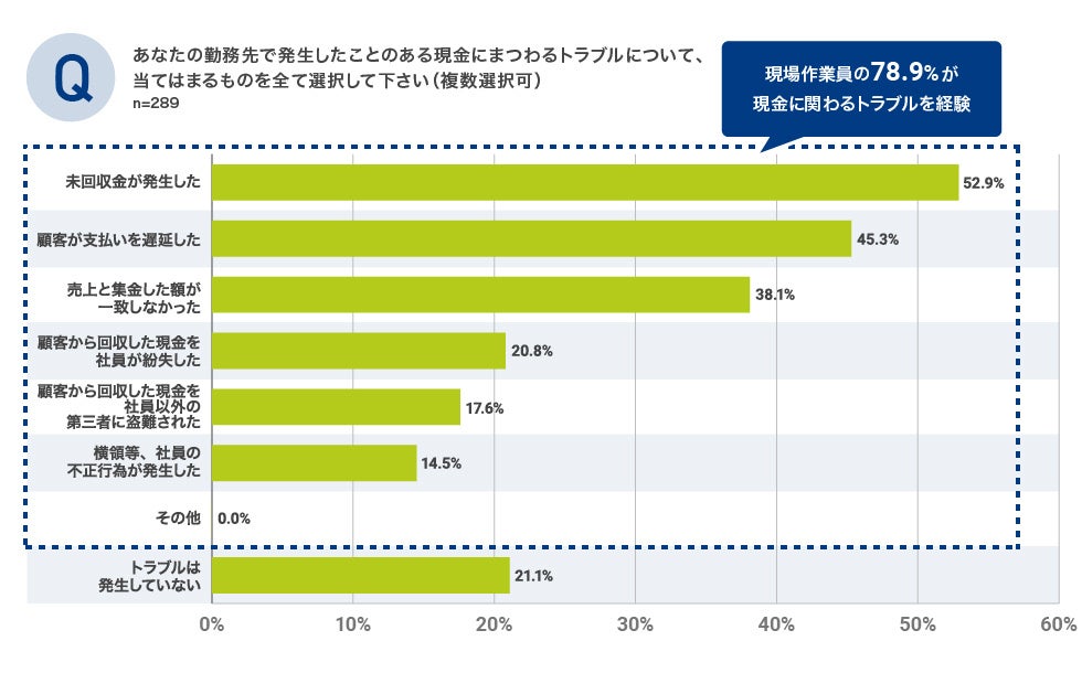 集金を担当する現場作業員で「トラブルは発生していない」と回答したのは21.1%で、残りの78.9%は現金にまつわるトラブルを経験している。トラブルの内容としては、1位「未回収金の発生」(52.9%)、2位「顧客の支払い遅延」(45.3%)、3位「売上と集金金額が一致しない」(38.1%)と続く。