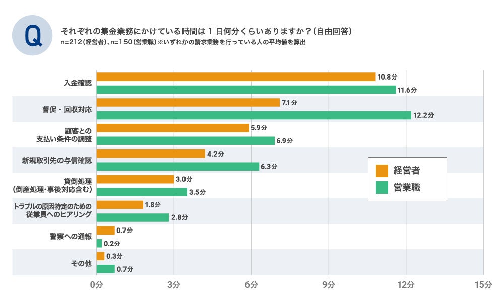 請求業務にかけている1日あたりの時間の平均は、経営者は「入金確認」(10.8分)、「督促・回収対応」(7.1分)と続く。営業職は「督促・回収対応」(12.2分)に最も時間を割かれており、その後「入金確認」(11.6分)と続いている。
