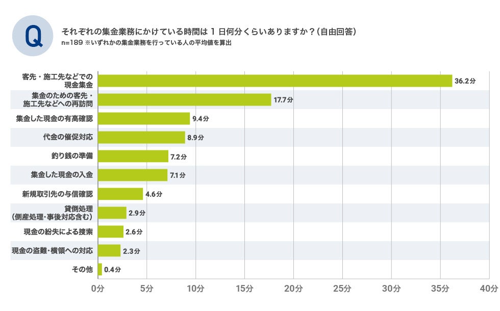 集金業務にかけている1日あたりの時間の平均は1位「客先・施工先などでの現金集金」(36.2分)、2位「集金のための客先・施工先などへの再訪問」(17.7分)、3位「集金した現金の有高確認」(9.4分)と続く。特に時間が割かれている「客先・施工先などでの現金集金」を1か月(20営業日)で換算すると、1か月あたり約12時間をその作業に充てていることがわかった。